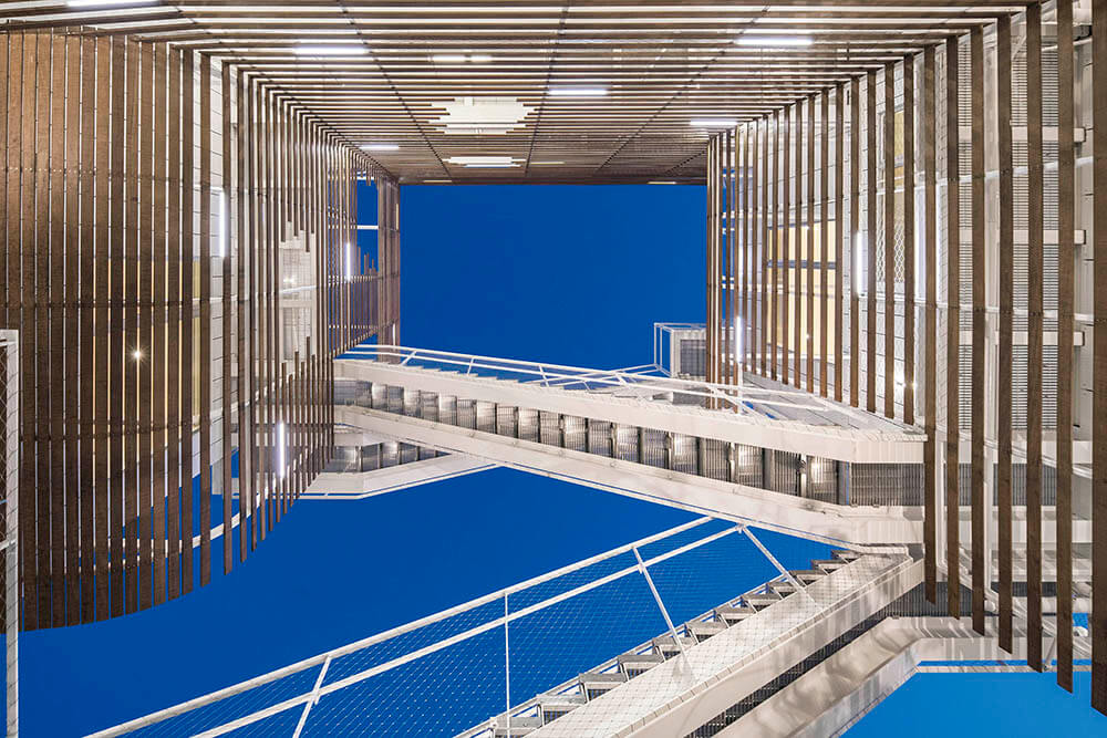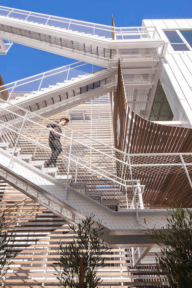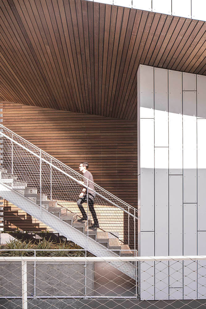 All circulation, including the primary exterior sculptural stair, is set within this common courtyard, encouraging social interaction and a sense of community between residents and visitors. Integral to the design, this centrally located amenity allows all units to have exterior access directly from the courtyard, while eliminating the need for mechanically climate-controlled corridors. The courtyard design is programmed with seating areas, a water feature, and various plantings.