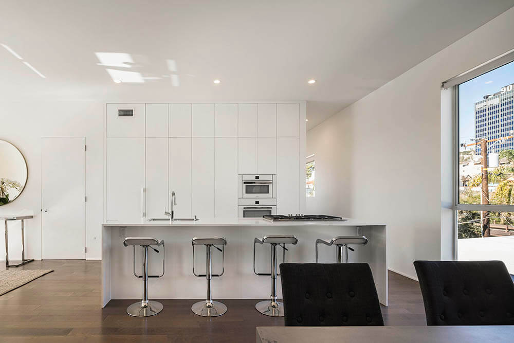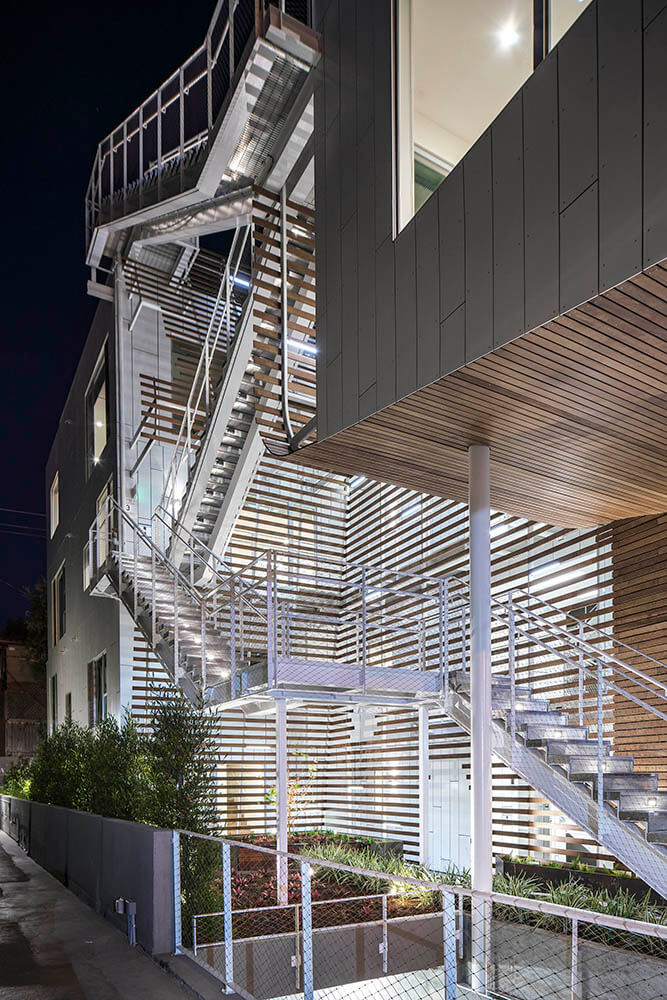 Entered from ground level, there are three walk-up, two-story town homes and on upper floors, four single-story flats. All units have at least three exterior exposures allowing light to enter from all sides. Additionally, all units are all single loaded, providing cross ventilation and passive cooling.