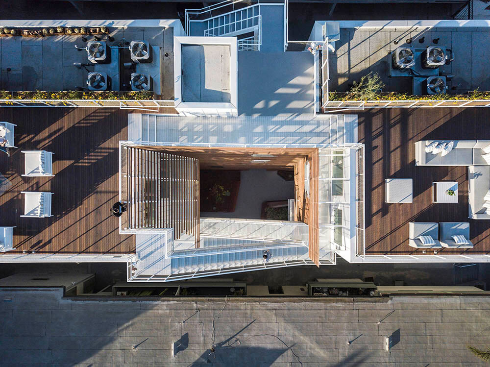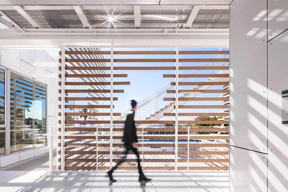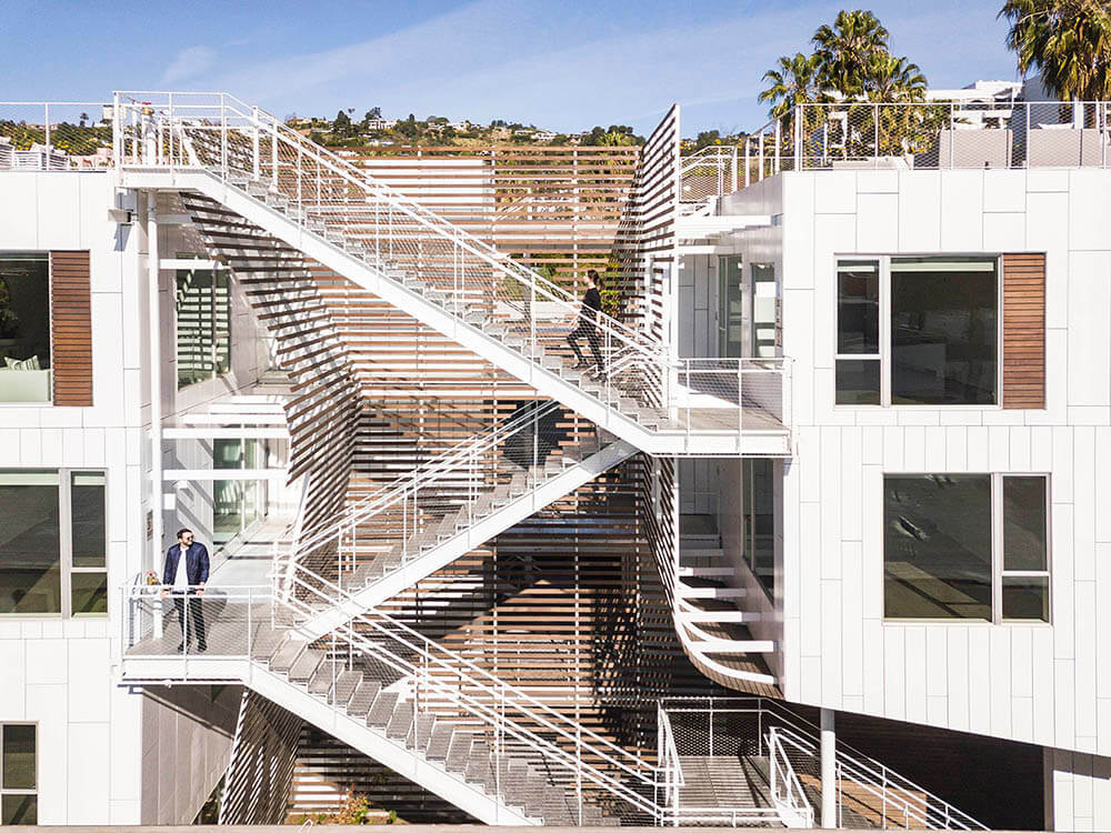In an effort to extend the street into the building, one quarter of the main elevation facing San Vicente 935 is carved away to provide a direct visual and physical connection between the street and the courtyard space. Emphasized by both material and form, the double-height void provides an open, light-filled passageway, while reducing the project’s mass at the street front and contributing porosity and visual accessibility to the project.