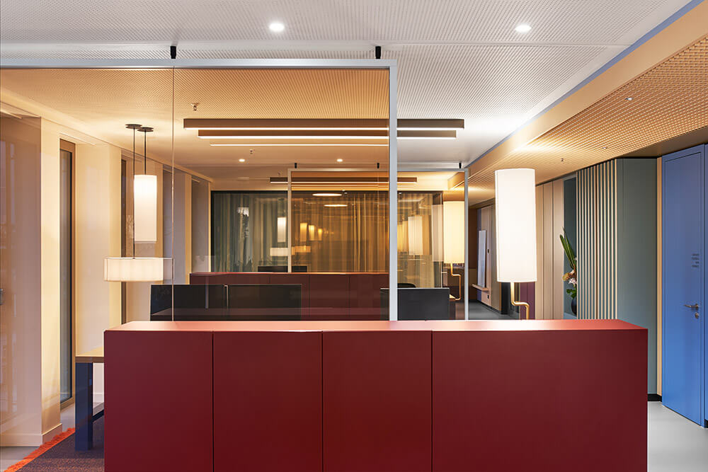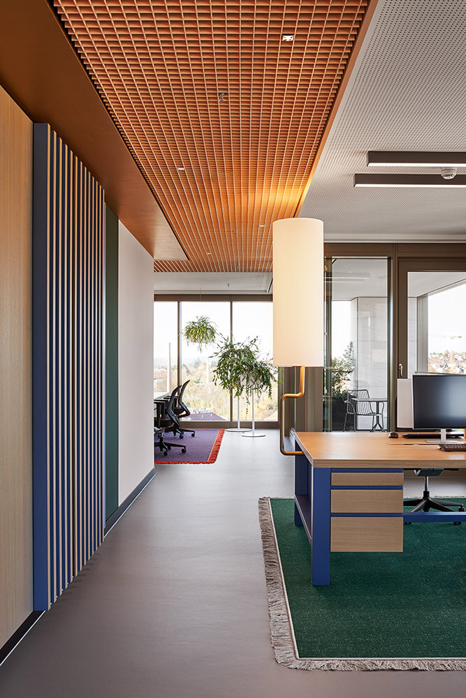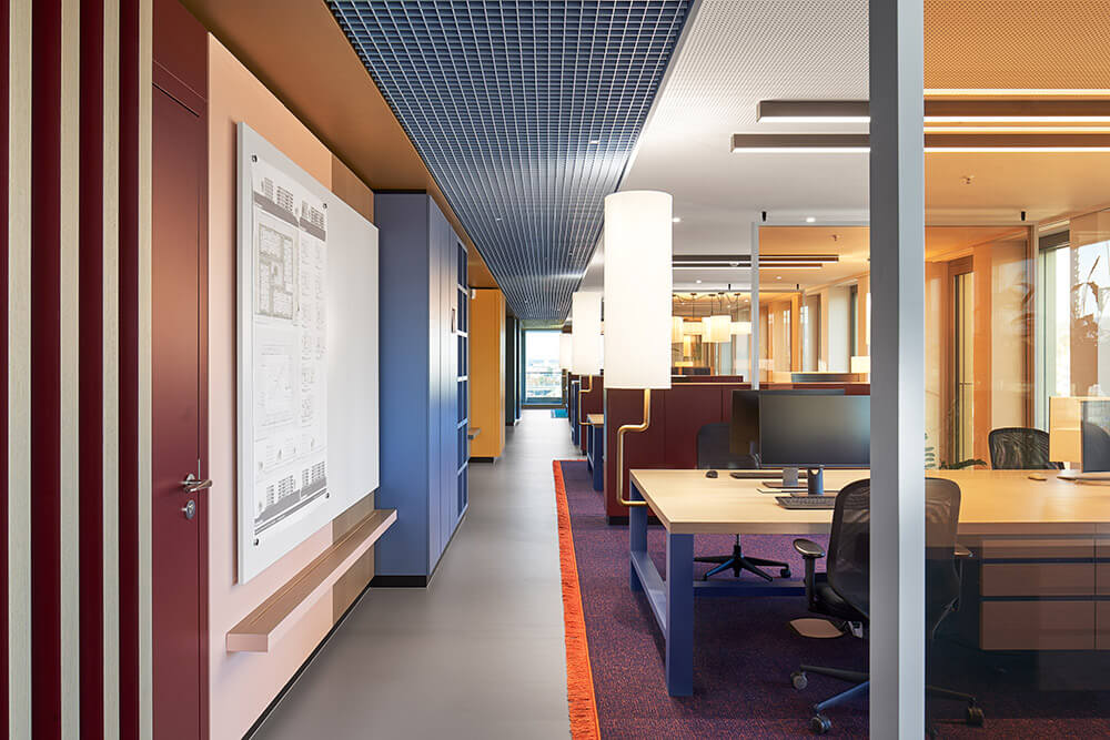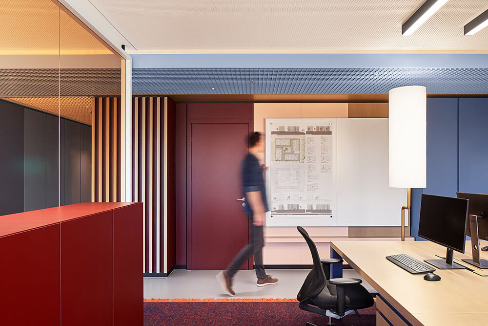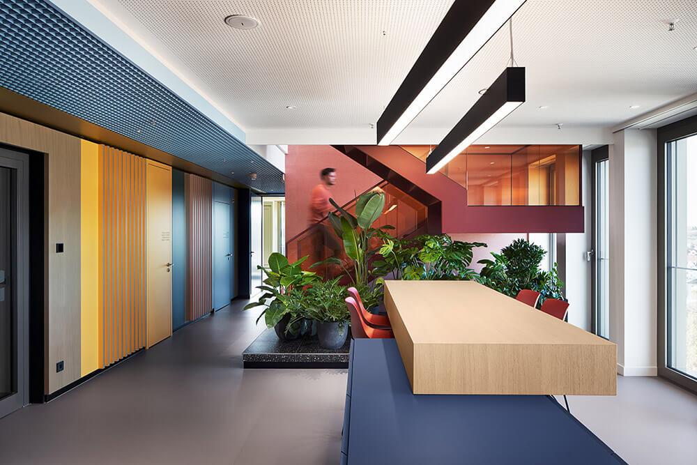 The fact that employees feel so comfortable and welcome here has a lot to do with excellent room acoustics and a pleasant interior climate – supported by the lush green planting in the space (à GREENTERIOR). It is also thanks to a superior depth of detail, which is expressed in the precise choice of materials and furniture, as well as in the lighting scheme, which combines natural light, ceiling lights and bespoke desk lighting. Both these things ensure that the up to 48 workstations are used by people who understand their place of work as a landscape of values, endowing them with a sense of belonging and a purpose for their actions. It ultimately also has a lot to do with the fact that the team was involved in designing the space: workshops with representatives from all three departments (real estate, administration, renewables) helped determine the table constellations, workplace-proximate exchange and meeting options, as well as the three colour worlds. The latter vary in tone depending on the field of work, and form a visual unit with carpet, ceiling and a wall section in the hallway. In this way, employees – at their own workstation, in the direct team area or the office as a whole – are taken on a visual journey where they can create individual connections, discover new things time and time again, make the space their own bit by bit, and identify with it properly.
