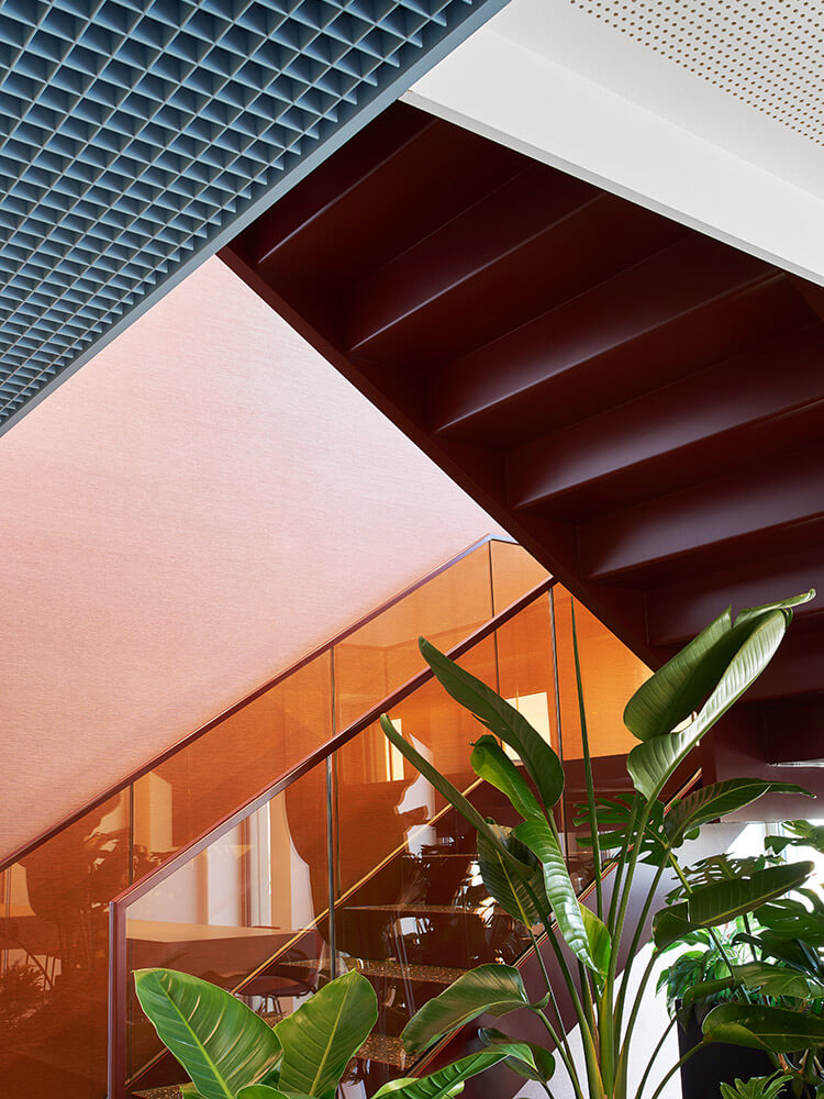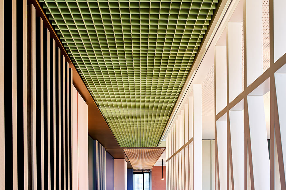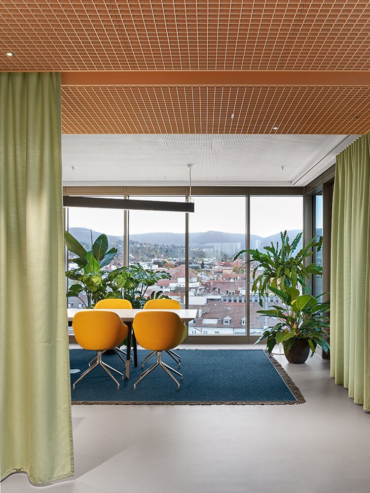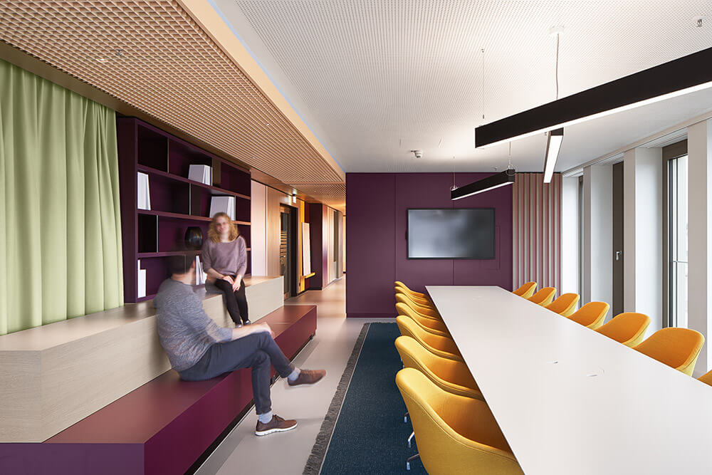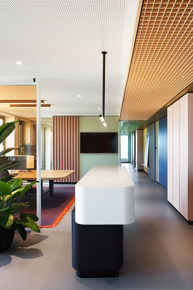 The fact that employees feel so comfortable and welcome here has a lot to do with excellent room acoustics and a pleasant interior climate – supported by the lush green planting in the space (à GREENTERIOR). It is also thanks to a superior depth of detail, which is expressed in the precise choice of materials and furniture, as well as in the lighting scheme, which combines natural light, ceiling lights and bespoke desk lighting. Both these things ensure that the up to 48 workstations are used by people who understand their place of work as a landscape of values, endowing them with a sense of belonging and a purpose for their actions. It ultimately also has a lot to do with the fact that the team was involved in designing the space: workshops with representatives from all three departments (real estate, administration, renewables) helped determine the table constellations, workplace-proximate exchange and meeting options, as well as the three colour worlds. The latter vary in tone depending on the field of work, and form a visual unit with carpet, ceiling and a wall section in the hallway. In this way, employees – at their own workstation, in the direct team area or the office as a whole – are taken on a visual journey where they can create individual connections, discover new things time and time again, make the space their own bit by bit, and identify with it properly.
