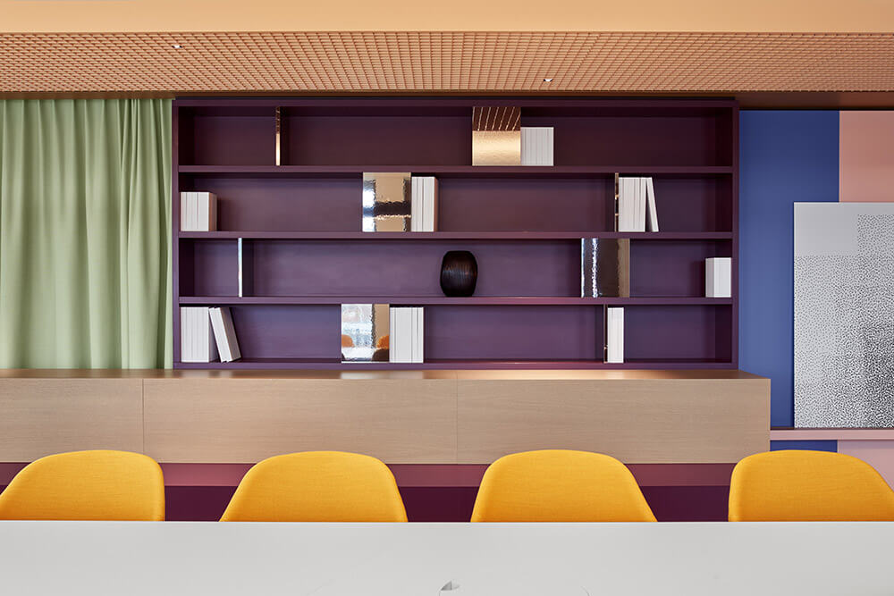 Despite these divisions, the space remains fluid and flows smoothly around the central access core. To transform this closed centre into a lively focal point, its design was deliberately exciting: Bold colours (à COLOUR IN SPACE) alternate dynamically with different materials and textures; shelves, picture rails and pinboards activate the area; integrated seating is arena-like, forming a lively meeting spot for smaller or larger teams. The space strikes the perfect balance between a collegial work environment and warmth or cosiness, without turning it into your living room at home.