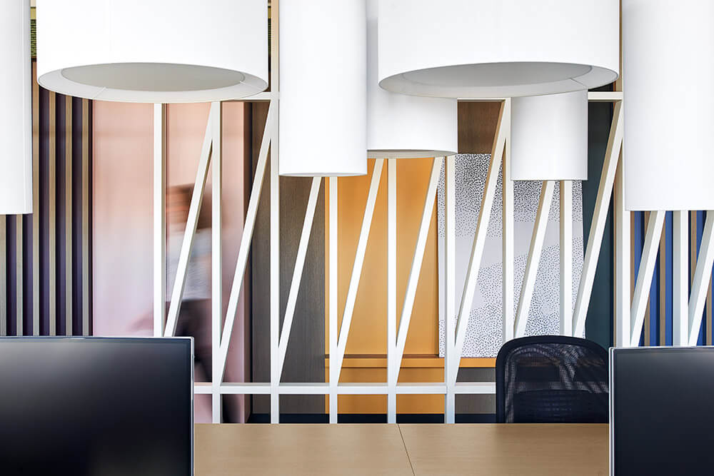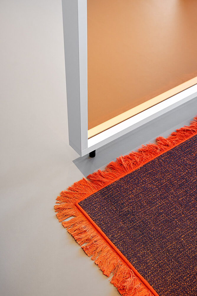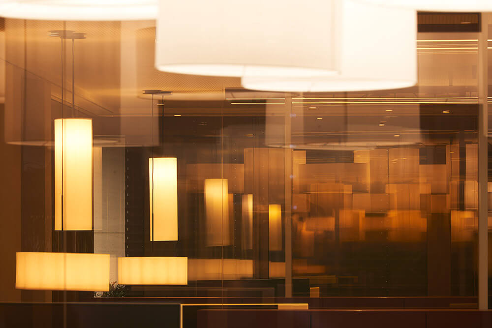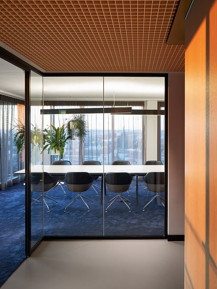 The clarity of the architecture (which imbues almost all Schöller SI projects) is continued in the interior – but becomes quite literally more multi-faceted: Tinted glass partition walls, pale curtains, linear storage units and fringed carpets zone the different areas, giving the space a rhythm that is characterised by overlays, reflections, transparency, but also by density. Accordingly, both open-plan and more intimate sections, as well as different work situations can arise: from the classic workbench and large shared tables, to lounge situations and alcove retreats. As a free interpretation of the slogan “Your office is where you are!” (à ACTIVITY-BASED WORKING), employees can decide which informal constellation best supplements their fixed workstation, supporting them in (internal) communication and thus helping them perform their daily tasks.