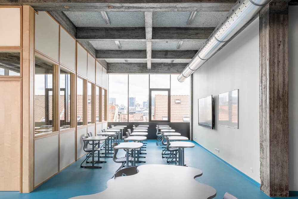 From tabaco depot to school. There is no bigger contrast. September 1st the students moved in on the historical site of former tabaco depot Saint Michel. The new campus should, in the first place, partially solve the shortage in Dutch education in Brussels, but also enlivens the Maritime neighbourhood in Molenbeek.