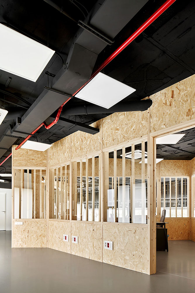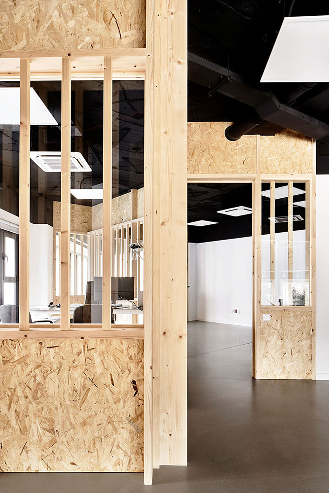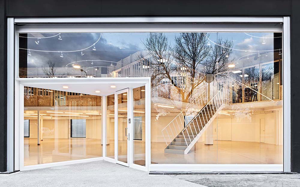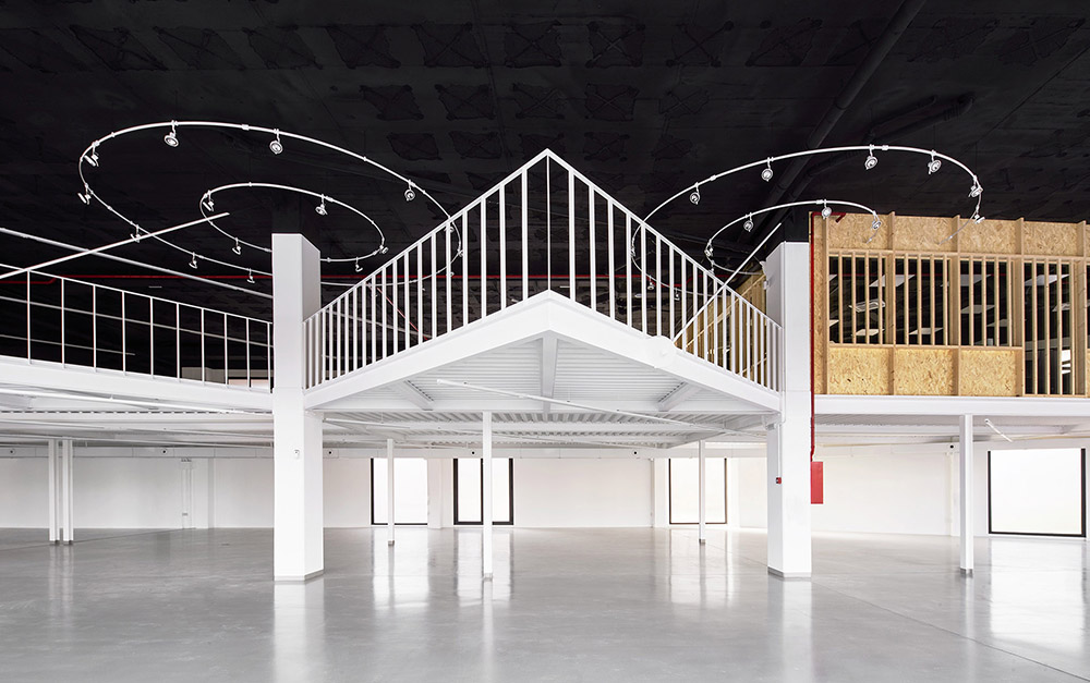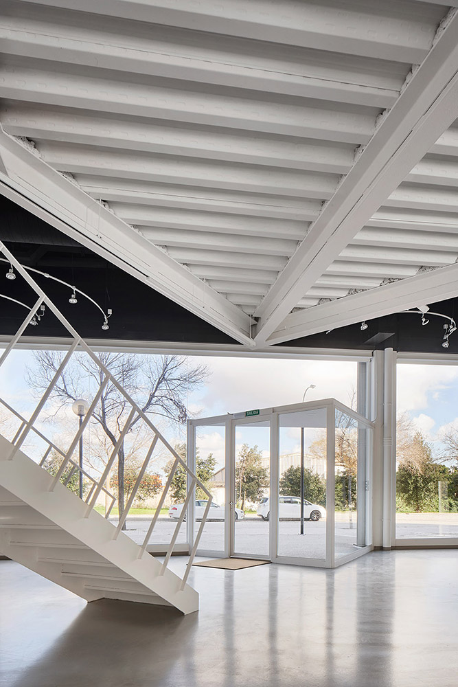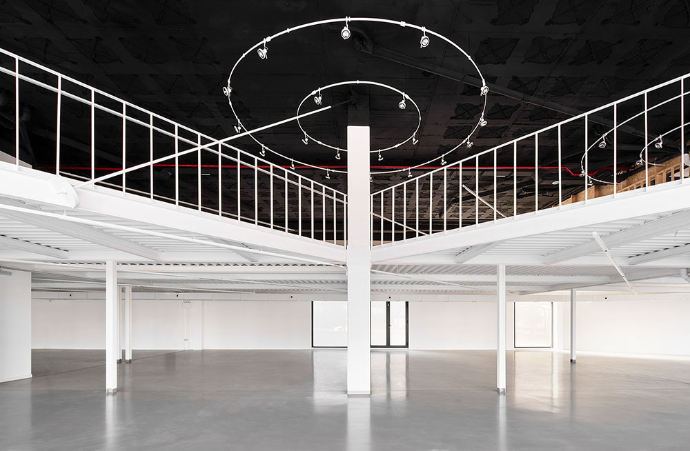 The addition of 8 attached industrial units with a slightly trapezoidal shape (20m x 7.60/8.20m) resulted to this commercial space. A sea of pillars appeared on a 1.235m² space, 5.80m high and slightly radial plant, when the 7 internal divisions were removed.
