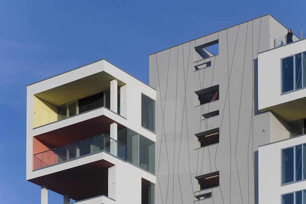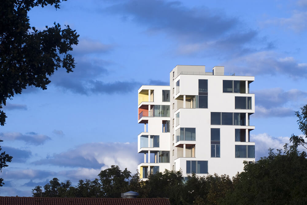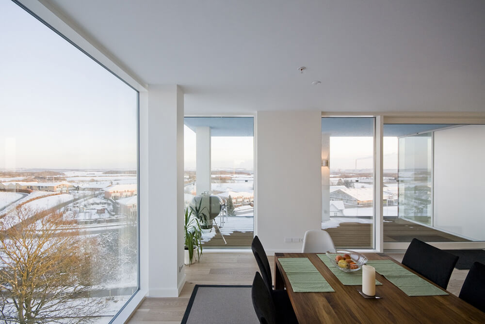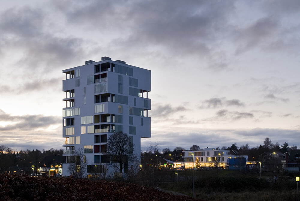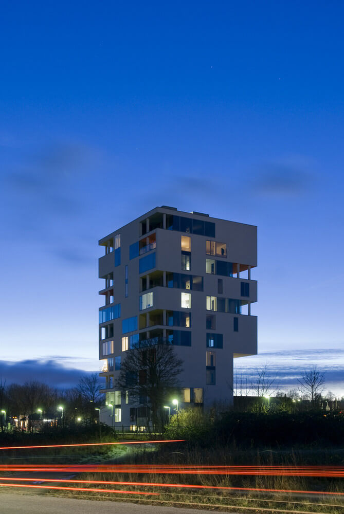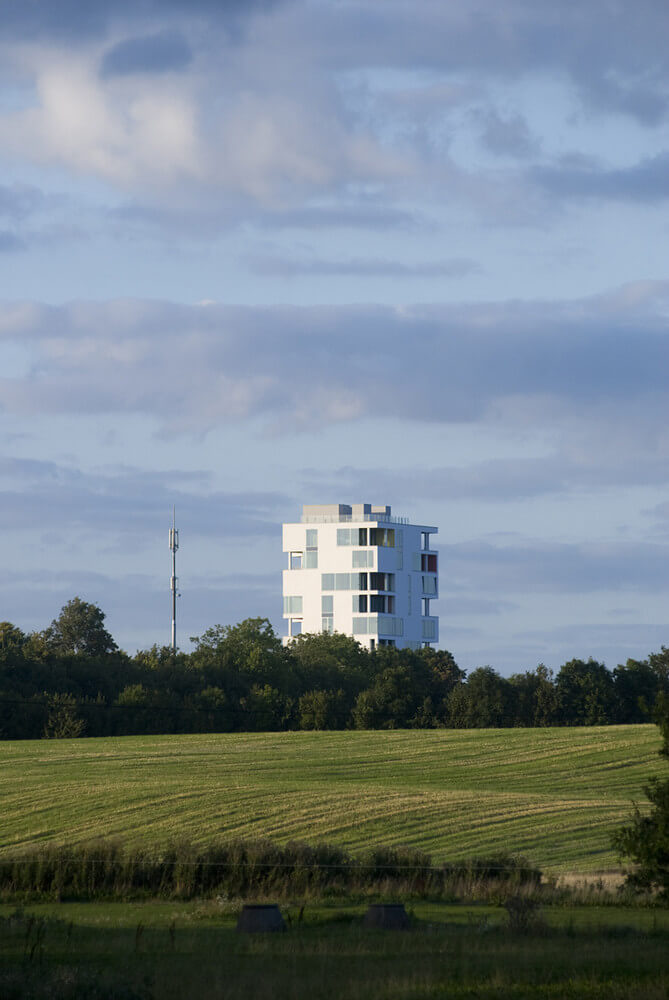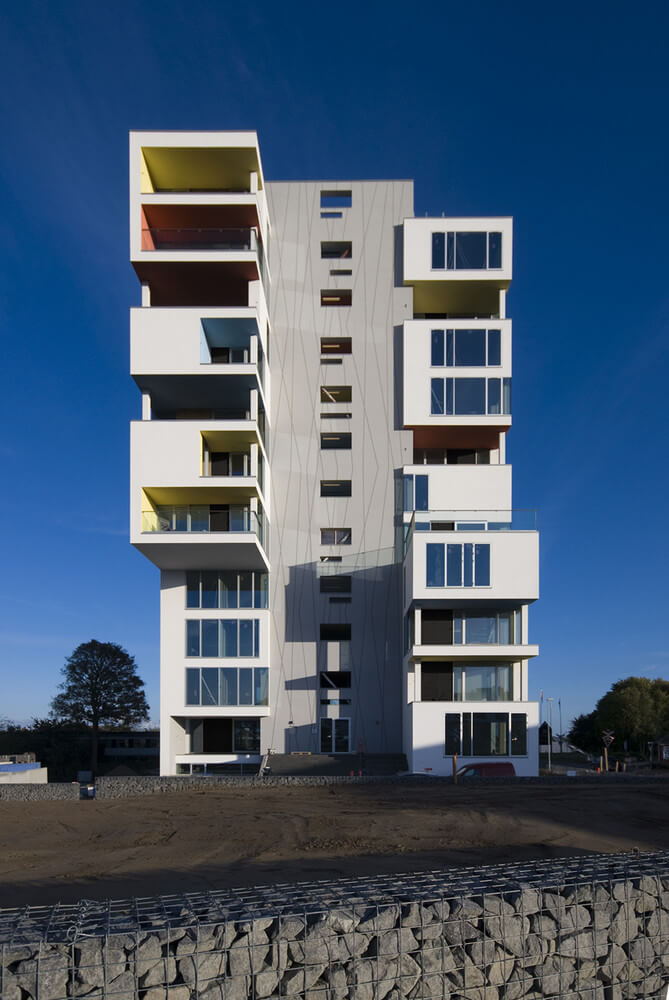 The actual silo contains staircases and lifts, and provides the base of a common roof terrace. Around the tower, the apartments are built up upon a steel structure in eye-catching forms which protrude out into the light and the landscape – a bit like Lego bricks.