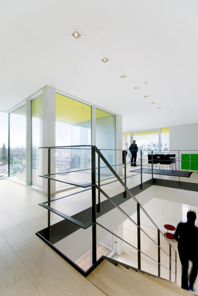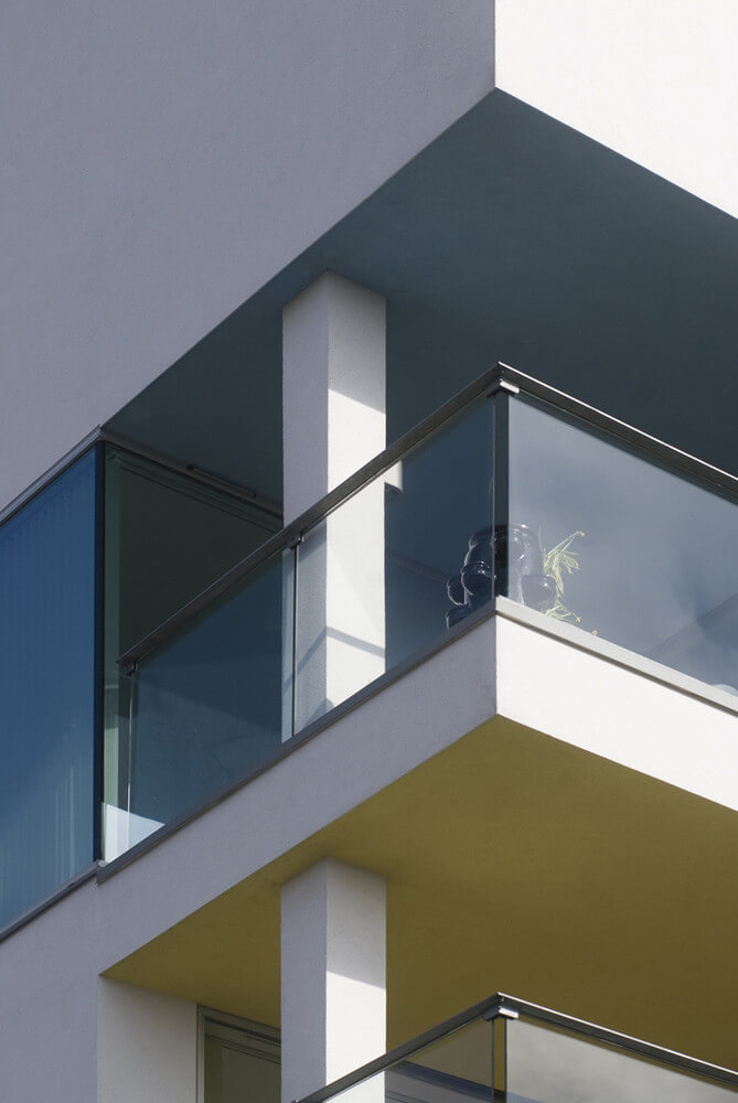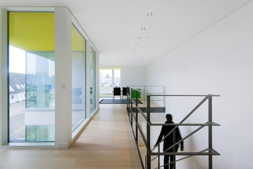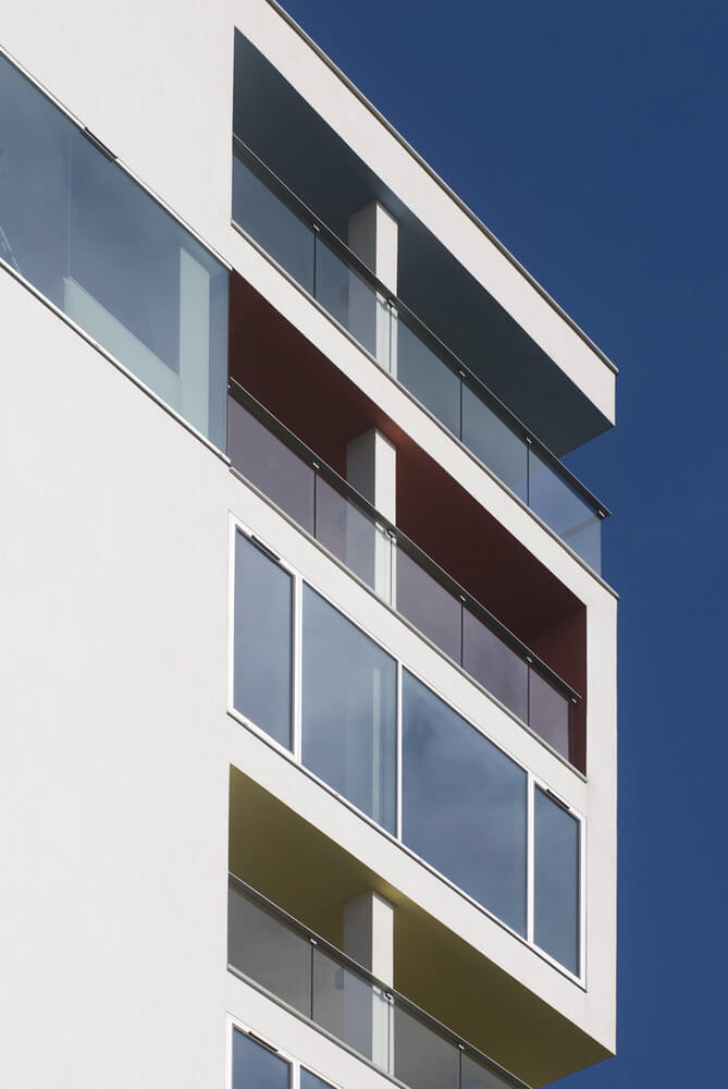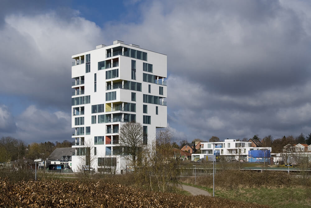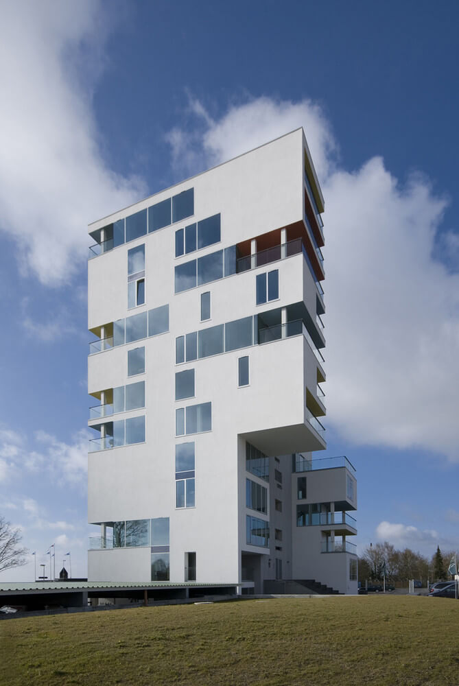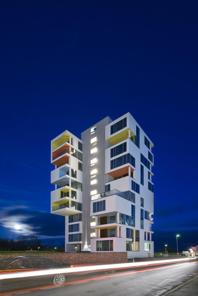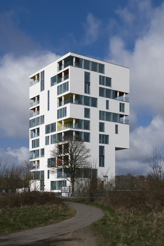 The actual silo contains staircases and lifts, and provides the base of a common roof terrace. Around the tower, the apartments are built up upon a steel structure in eye-catching forms which protrude out into the light and the landscape – a bit like Lego bricks.
