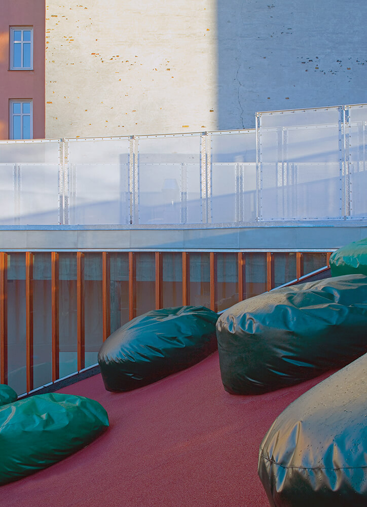 The slope makes for a natural connection between the ground and roof. The courtyard is placed in conjunction with the common room and is thus the gathering space for the outdoor areas. The slope is furnished with large outdoor sack chairs designed specifically for this purpose. The sack chairs ensure safe play on the ramp. Parasols can be fixed in the middle of the sack chairs, providing shade as so desired. The ramp serves as a seating area when there are events.