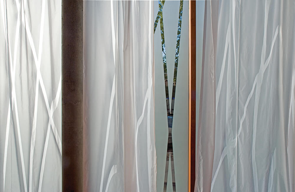 The curtains are made of white nylon parachute cloth. The ceilings are made up of acoustic panels with built-in ceiling light fixtures. The outdoor sack chairs are upholstered in tarpaulin cloth and are fixed in place with galvanized steel mounts, with a built-in parasol base.