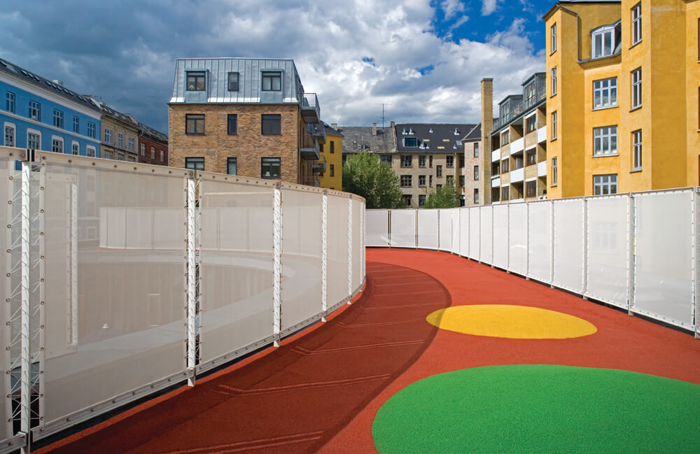 The roof garden connects directly with the slope and is designed as a free configuration on the actual roof plane. The roof garden is fenced by a white semi-transparent polyester fabric that allows for the maximum amount of openness and light intake. The garden is arranged as surfaces and mounds for a variety of activities, for example a barbeque area, sandboxes, water zone etc. The remaining activity areas of the roof surface can for example be used as roadway for moon cars and tri-cycling.