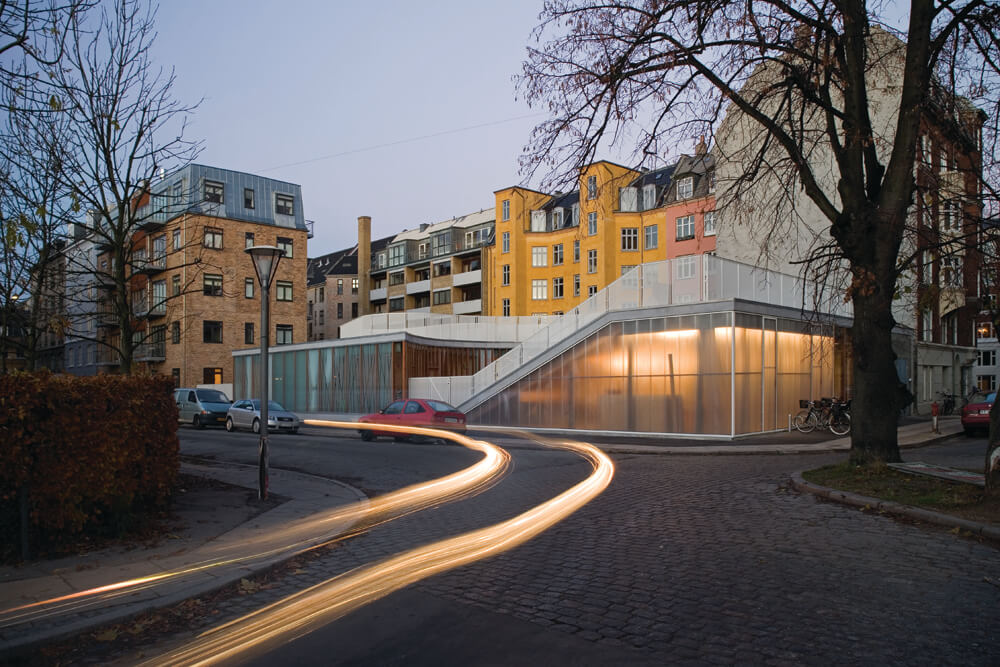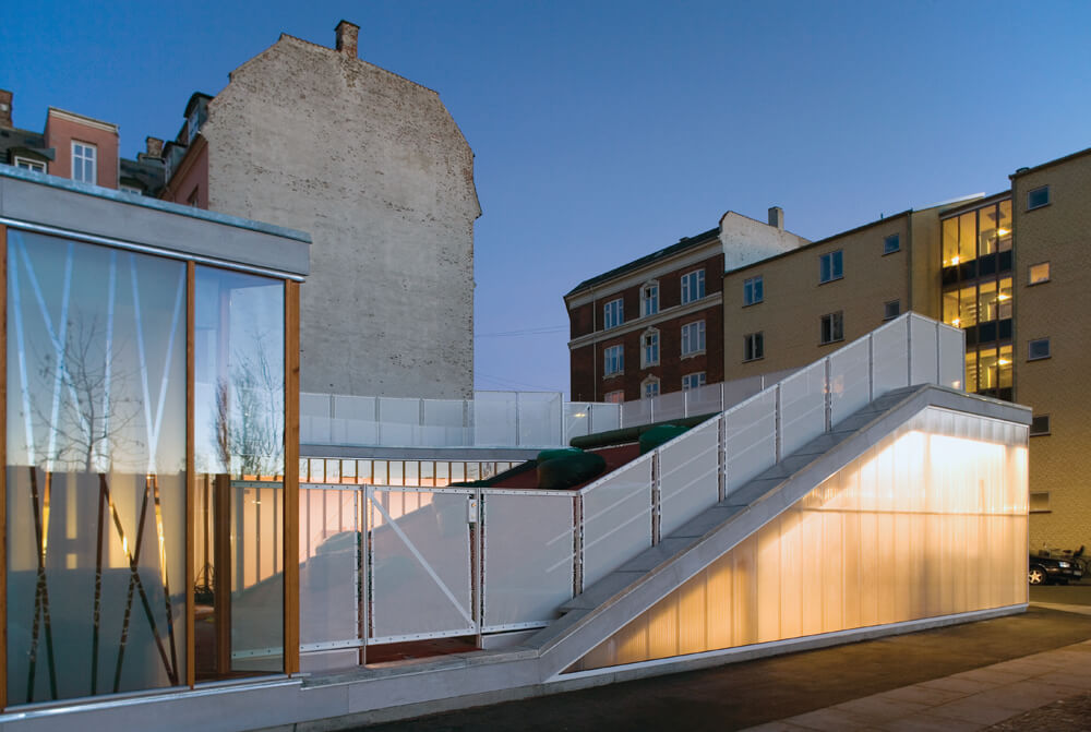 The building design is the result of the planning regulations and authorities and the call for the greatest possible connection between the outdoor areas of the ground and roof plans, and taking optimal advantage of site’s sun orientation. The building consists of two planes which extend to the boundaries of the site. One plane forms the ground terrain plane covering the contaminated ground, a second forms the roof. The ground terrain surface is folded upwards in such a way that it forms a hill or slope between the ground and roof. The path of the summer sun from northeast to northwest traces the cut of the slope. The slope angle offers the best sun exposure to both the slope and the courtyard from the south and west. Underneath the slope forms an unheated space where a forest of columns is used for swings and other forms of play, when the weather is cold or wet. Two other light wells cut into the roof plane ensure daylight and a variety of outdoor space in conjunction with the other rooms of the building.