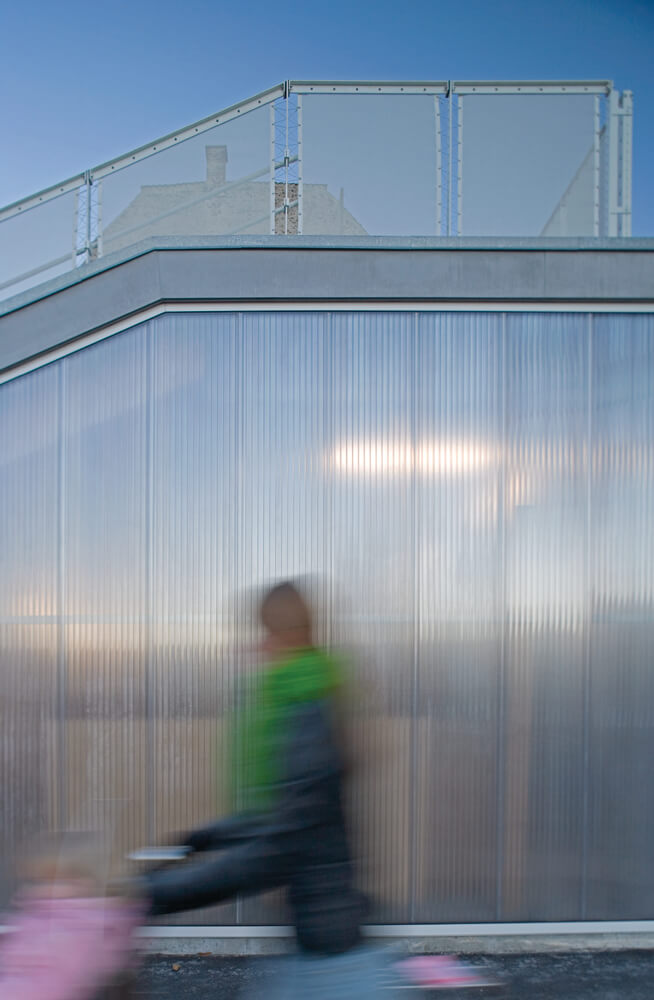 The area underneath the slope is a subsidiary space used as an unheated play zone. The space is screened to the south and west by polycarbonate, taking advantage of passive solar heating during the winter months. Swings are suspended between the columns, and the institution’s baby carriages and playground toys are stored behind a simple sliding wall of plywood.
