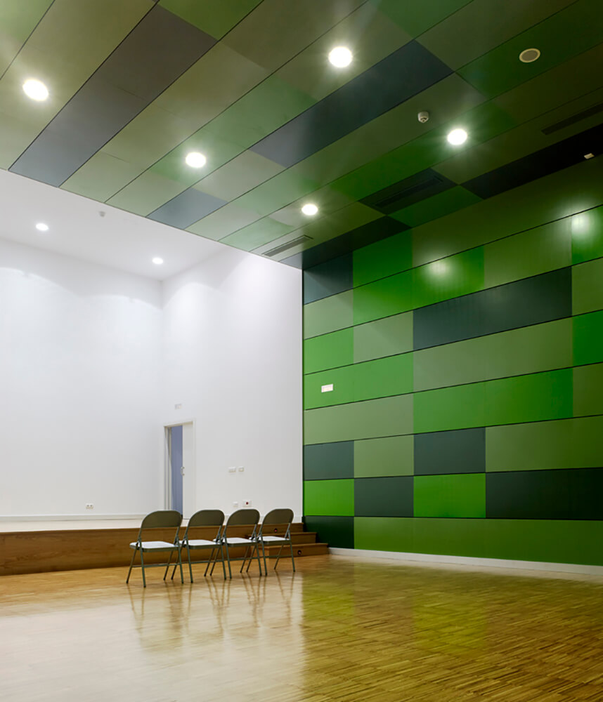 The building is arranged into three volumes. The greater height volume has an entrance hall and multi-purpose room. The next volume houses a play room, social offices, reading room, multipurpose room, dressing rooms, toilets and plant rooms. The distribution of the edifice proposes to create a large open space in the center. The space can be divided according to needs of exhibitions or events it houses, using movable panels.