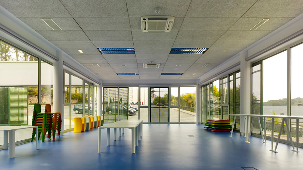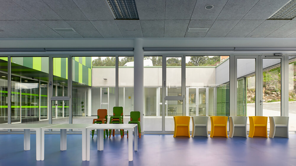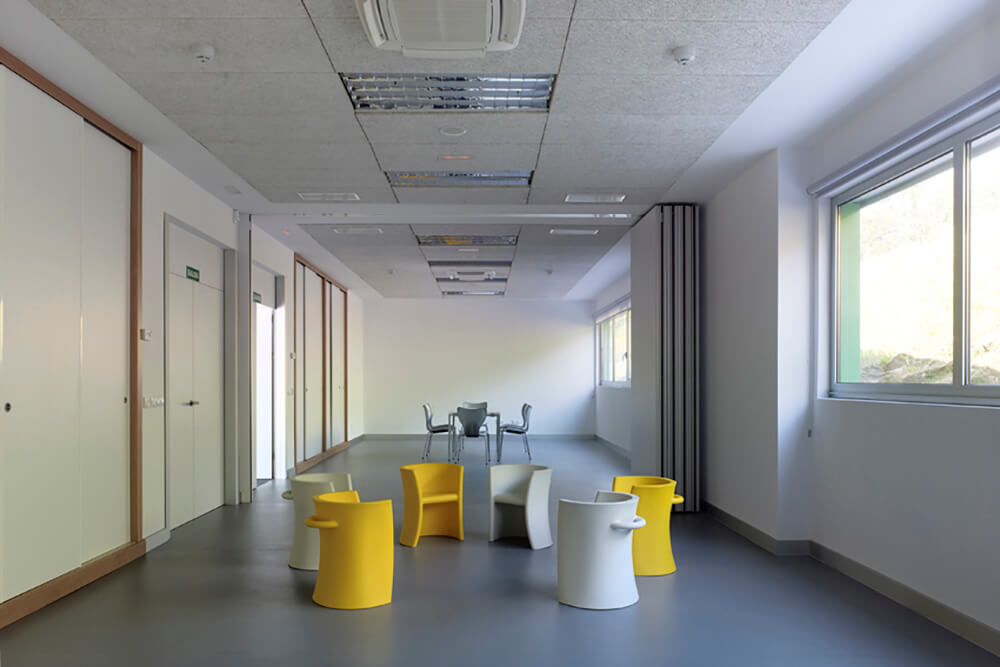 The programme develops in a single floor at ground level. The building and rooms are entered through a front interior courtyard that is directly connected to the hall and auditorium. This courtyard is protected place from prevailing winds of the zone and it serves as an outside play area for children, but joined to the interior play room.