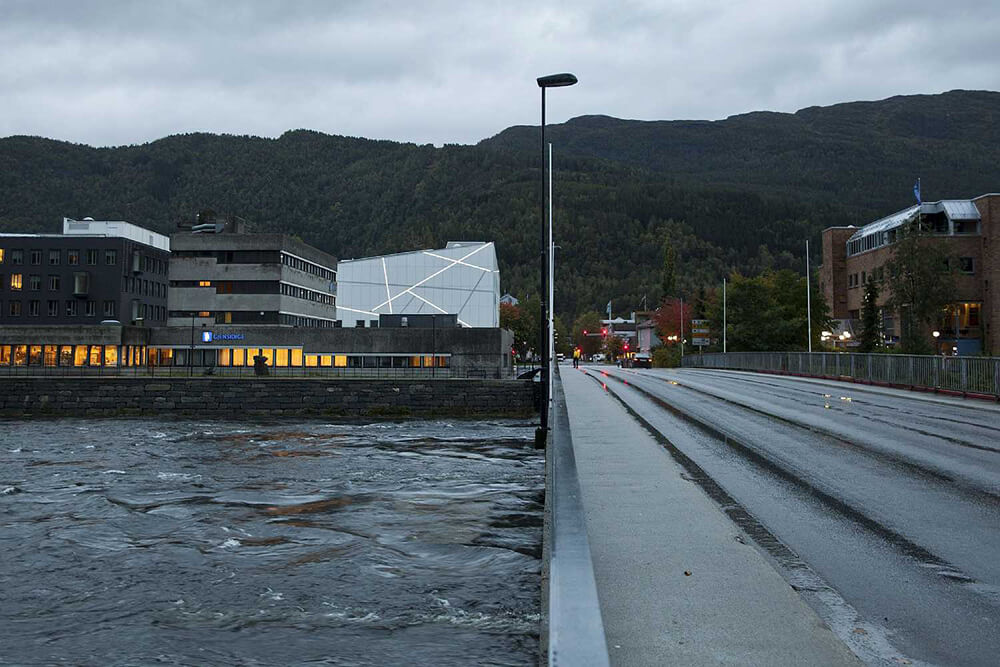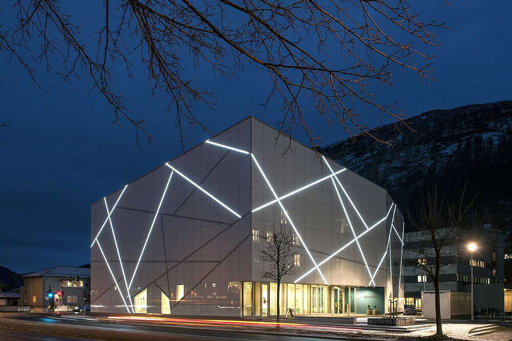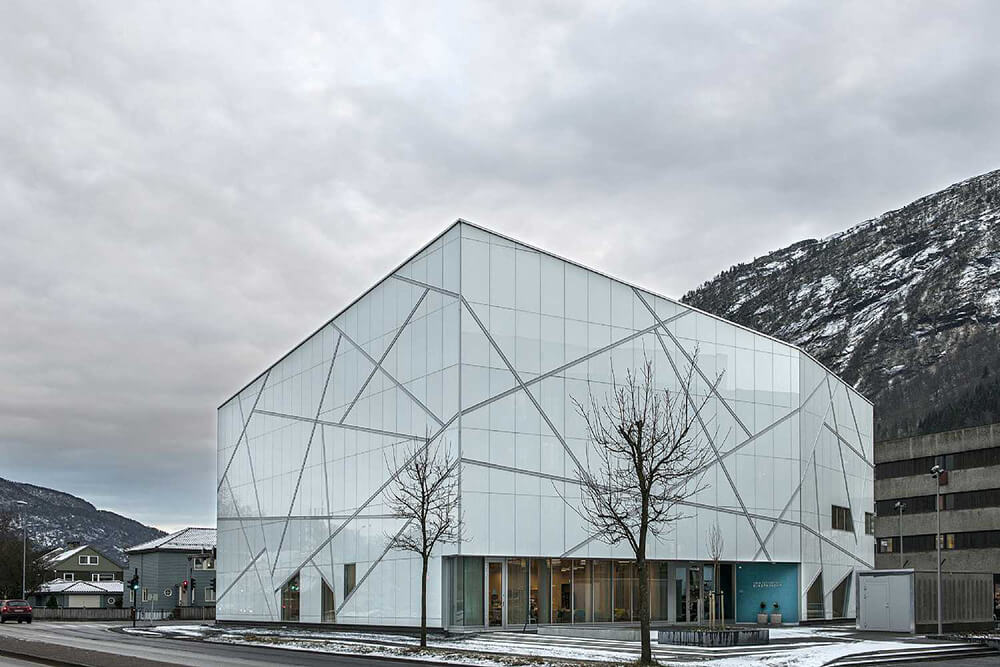 The Sogn and Fjordane Art Museum lies in the centre of Førde, surrounded by the mountains. The museum’s architecture was inspired by the county’s many glaciers, with a building designed to resemble a massive blocks of ice that has rolled down from the frozen mountains.