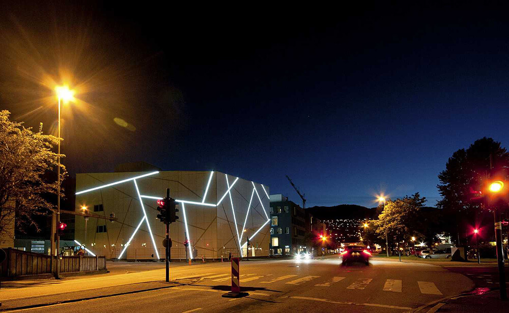 The compact form of the museum brings a new focus point to the town. The facades consist of irregular opaque glass surfaces, with lines referring to cracks in the ice to create an irregular dynamism. The lines are illuminated at night, to give the building the impression of a sparkling block in the midst of the town’s darkness.