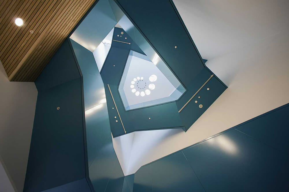 Inside, the museum’s crystalline form provides an asymmetric floor layout. Visitors progress through the four floors in an open stairwell with a colour-saturated turquoise staircase that rises towards the light and the rooftop terrace’s panoramic view. The bright rooftop terrace is designed for outdoor shows and exhibitions.