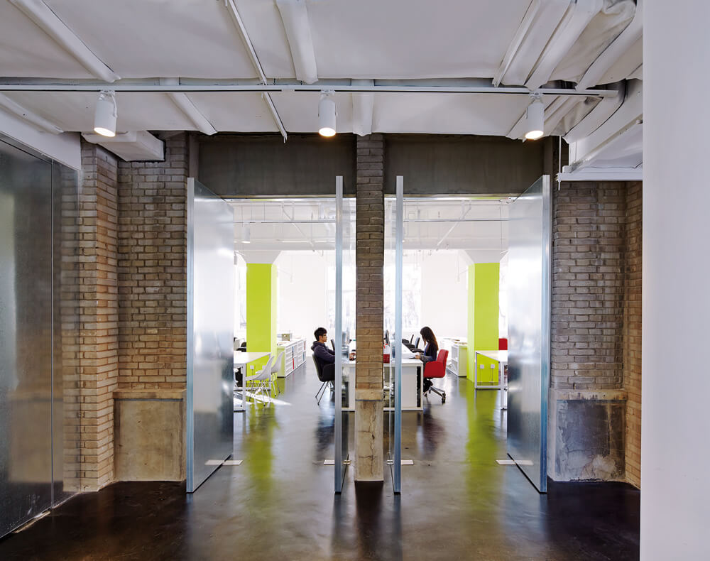The flux of the reception area, meeting room and kitchen can be discontinued via floor to ceiling swivel doors whenever activities require it.