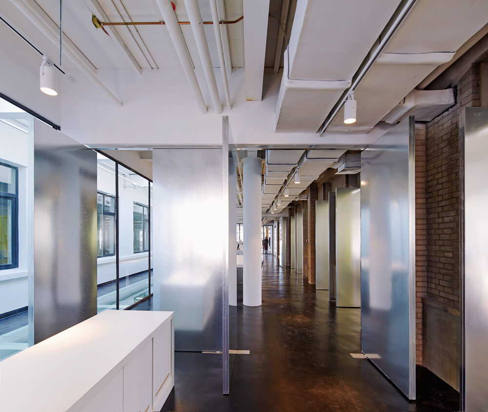 Alongside the main work space a continuous wall of metal cladded swivel doors allow for a playful and flexible configuration of “open and close”.