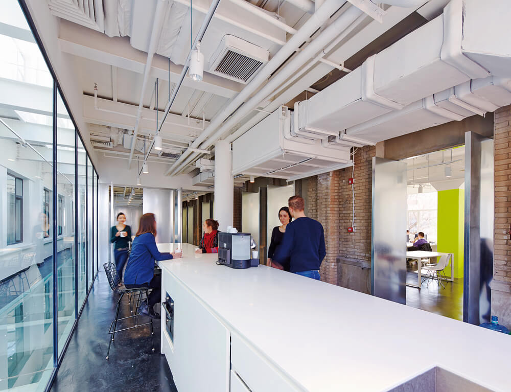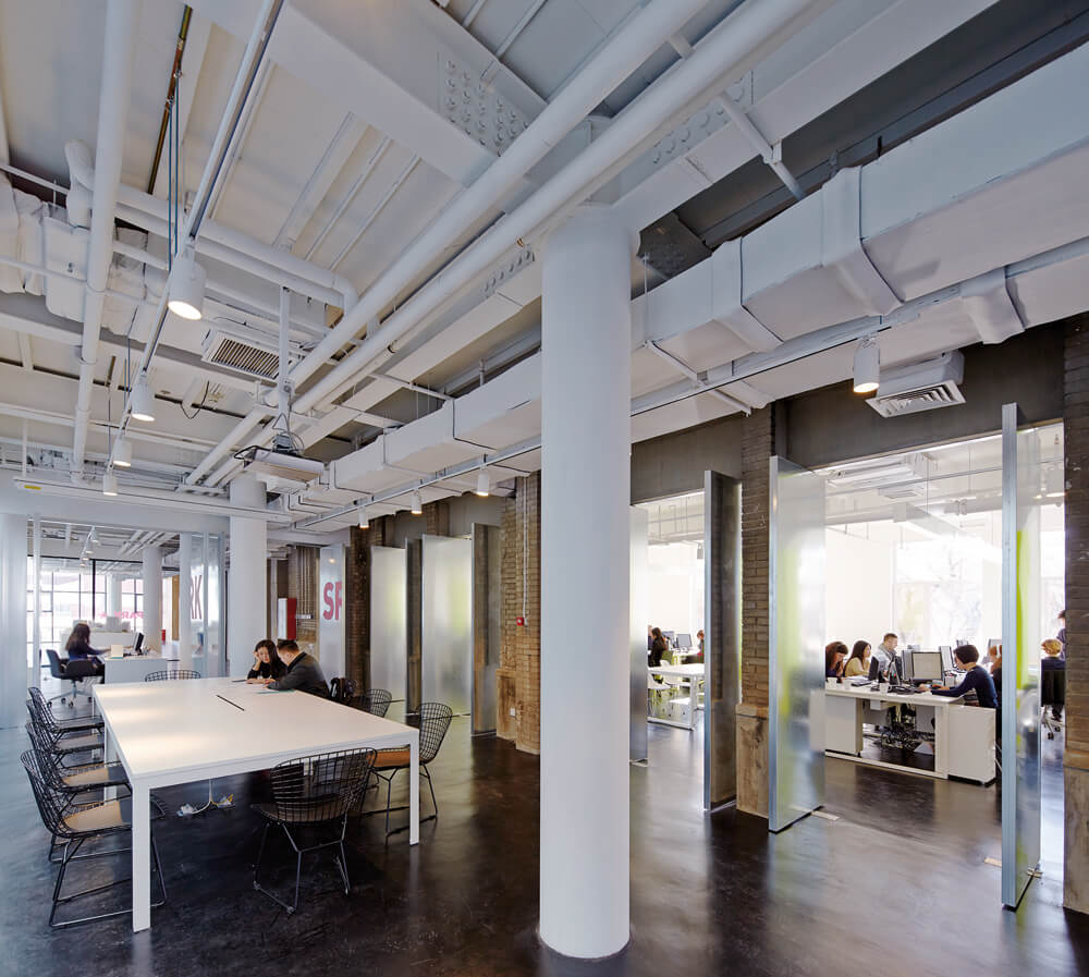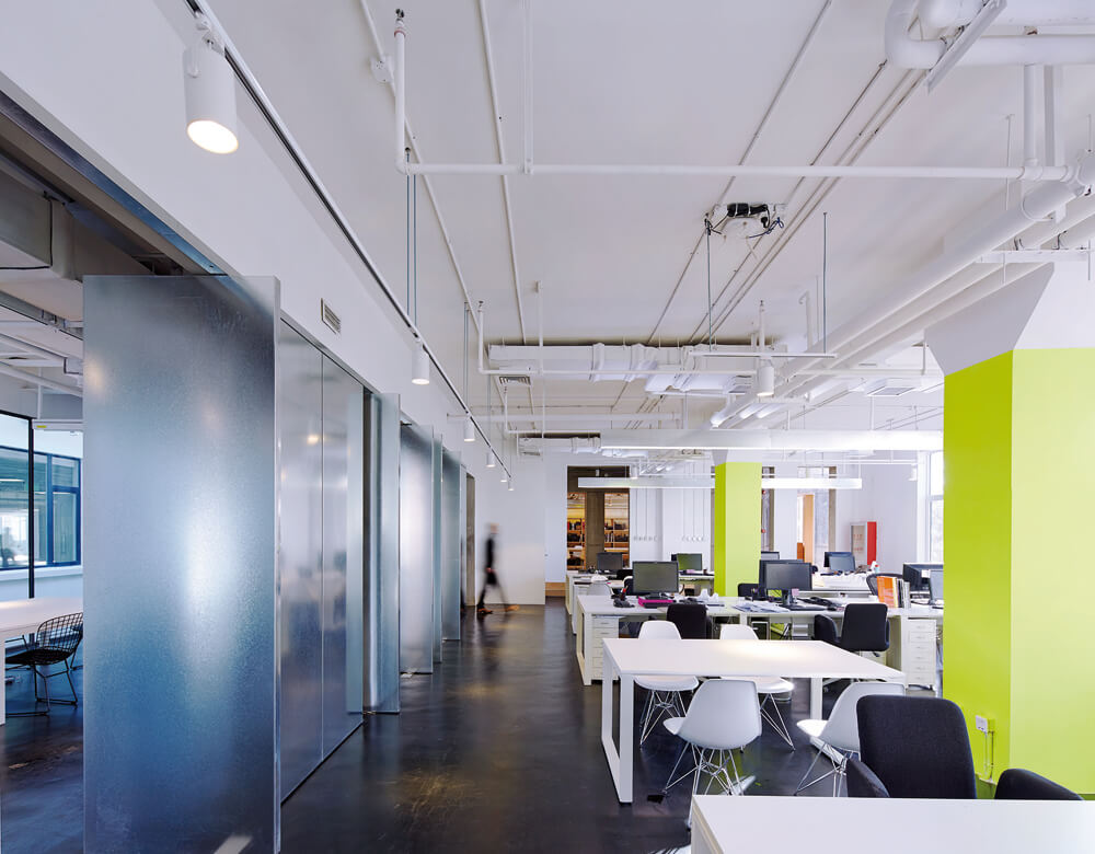 The space is loosely zoned into a main work area, kitchen and gathering space, a large meeting room area, a model making room and smaller meeting room.