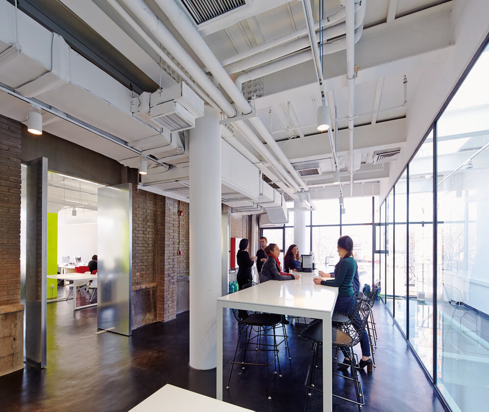 An annex glass box had been added to second floor of the existing building allowing for the exterior brick façade to be experienced as an interior space.