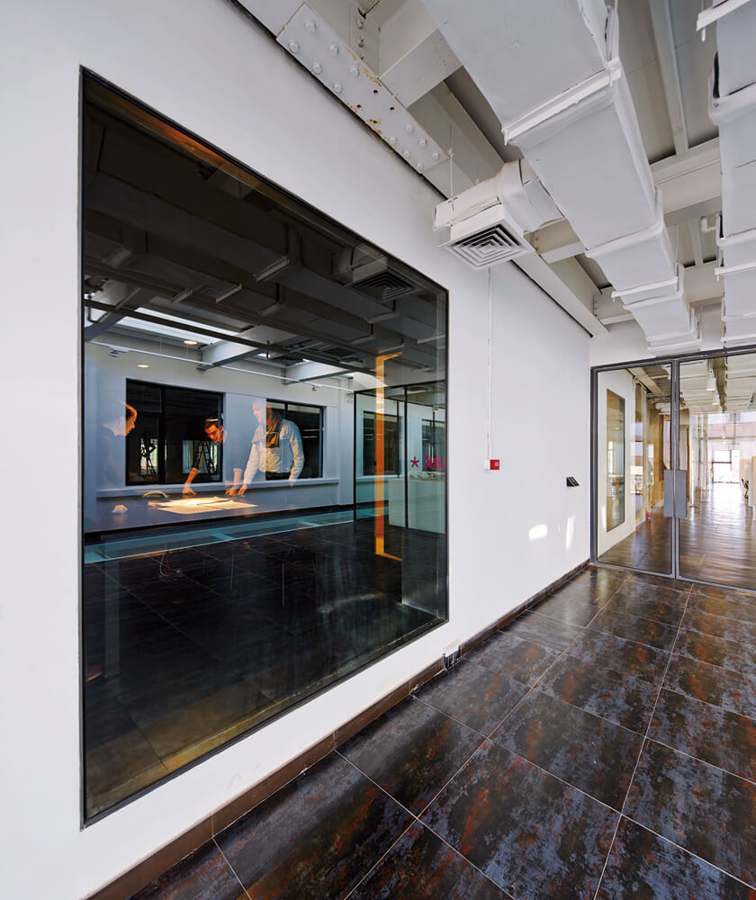 The model making room, themed as “the ply room” is accessible via multiple routes through an extreme vertical space of what used to be a stairwell core.