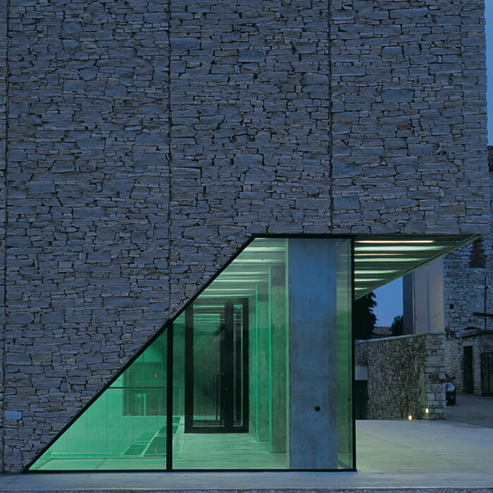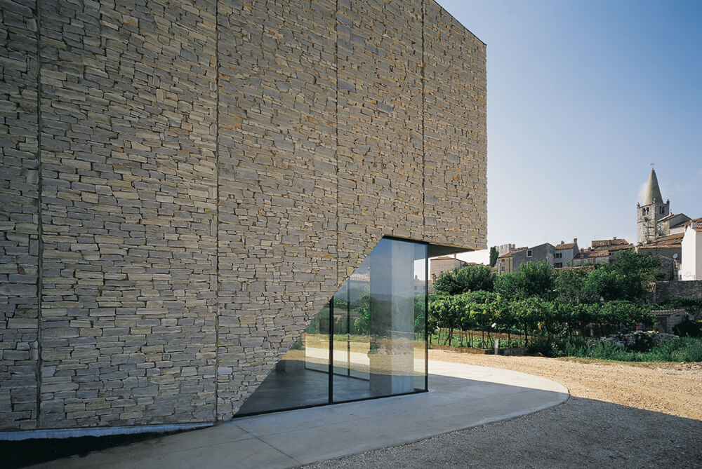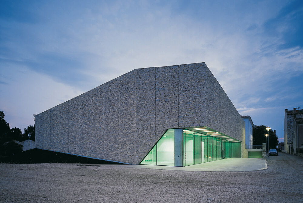 The structure had as an inspiration the small traditional stone hut – kažun, a small multifunctional building used as a shelter for shepherds that provide a cool environment in hot weather and insulating against the cold in the winter. Traditionally built without any cement or mortar with carefully selected interlocking stones found on the site this structure is a primitive example of prefabrication present in the Mediterranean since the prehistoric times. The whole surfacing of the sports hall used as a template/pattern the traditional local dry stone wall motif.