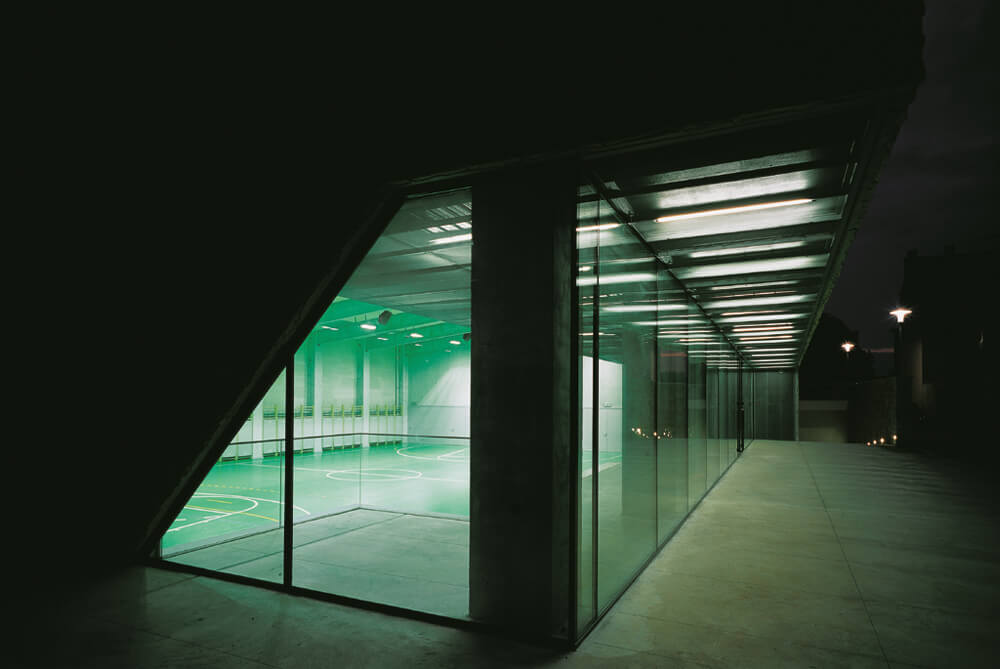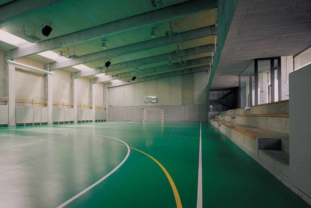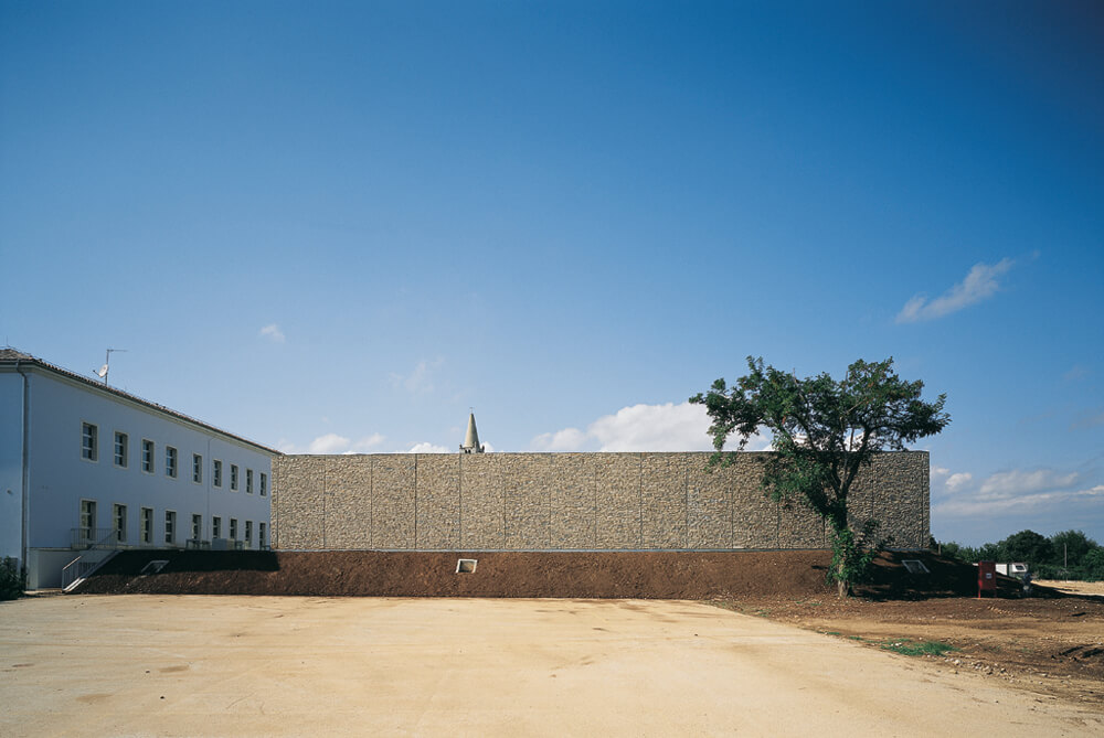 As it is the second largest building after the church, the social importance of the sports hall for the town community is quite important, as it is used as a public facility to host various social gatherings that range from community meetings and trade fairs to watching World Cup. Actually, the basketball playground is defined by the size of the building that is modified by additional facilities on the gallery. These include a fitness centre and a sauna and, at the same time, the low and small locker rooms are planned as a connection element to the school, between the old school and the utility rooms that is hidden underground. On the other hand, the private and intimate character of the building is juxtaposed to the open public primary function of the building and its openness by glass fronts to the street.