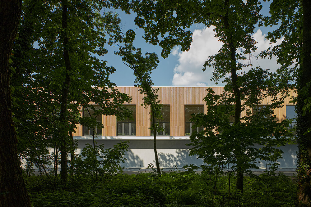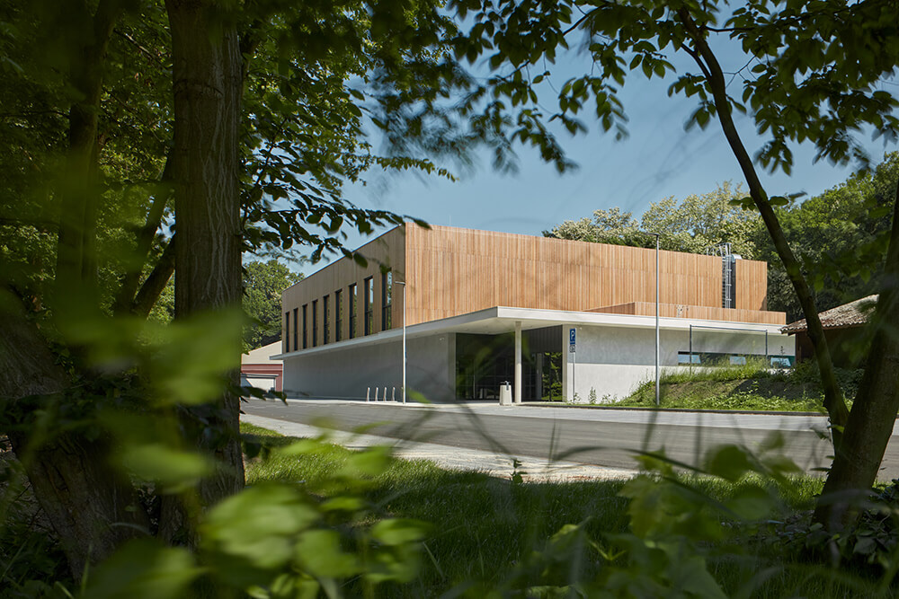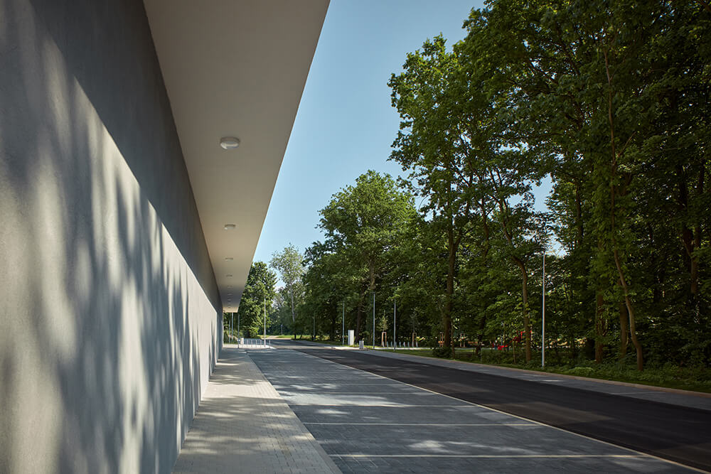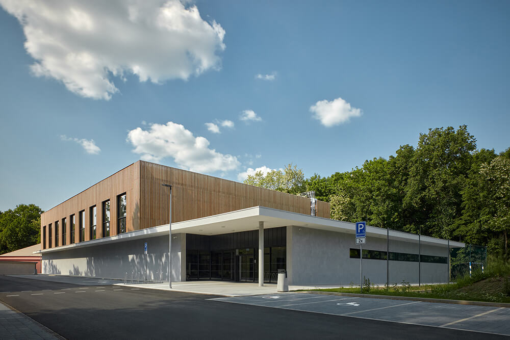The proposal is influenced by the surrounding flatness of the terrain, where it’s easy to bicycle. By the friendly atmosphere of the nearby town. By the slow flow of Elbe River and by the plot location in the woods. The concept is based on a low single storey building, roofed with an overlapping cantilever and the wooden mass of the elevated hall. The cantilever delimitates the low part of the building what brings a small-scale friendly atmosphere. The high wooden lantern is peaking over the lower part. The big windows illuminating the interior refer to the Czech tradition of Sokol sports halls with the optimistic spirit in the state-founding interwar period.