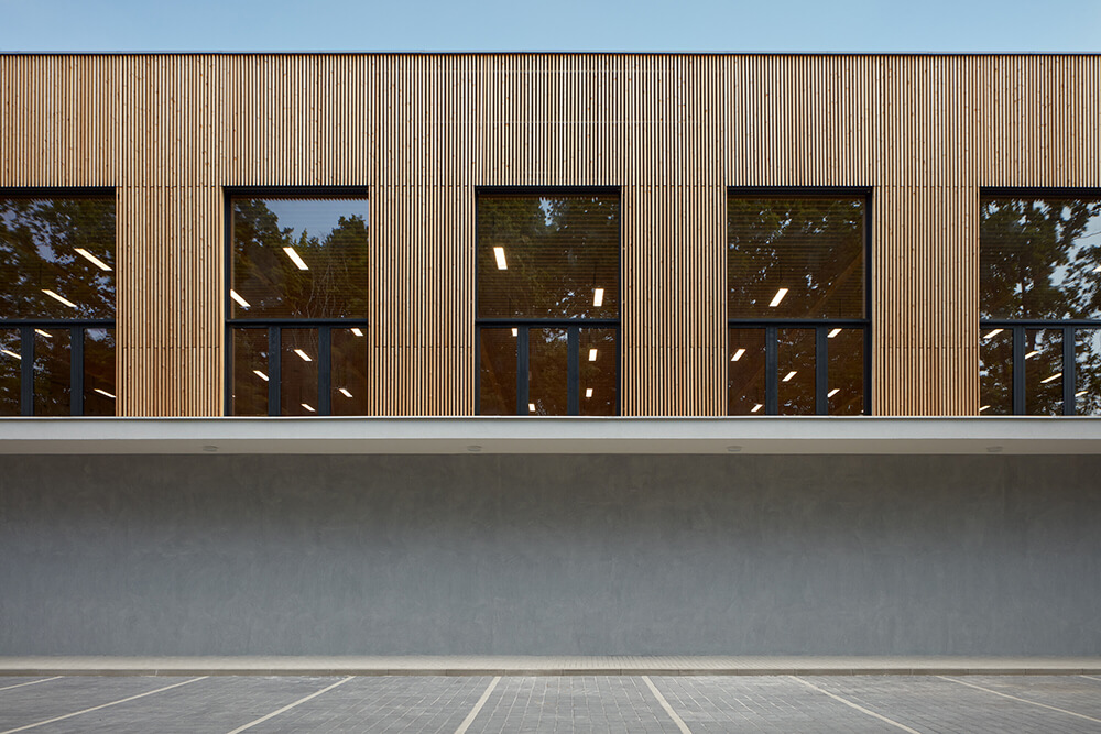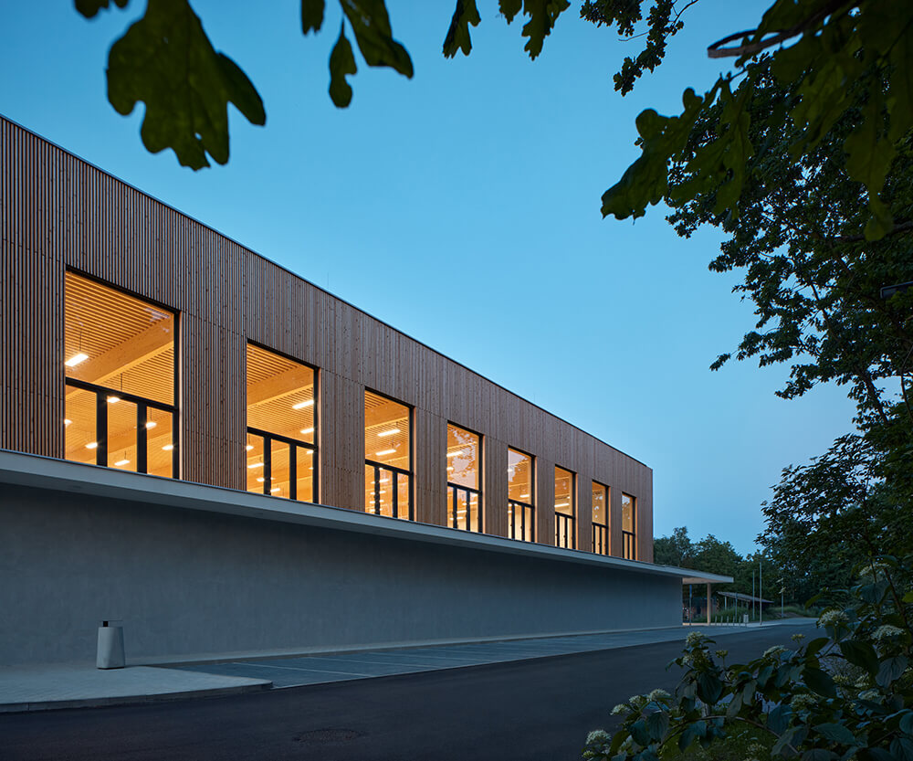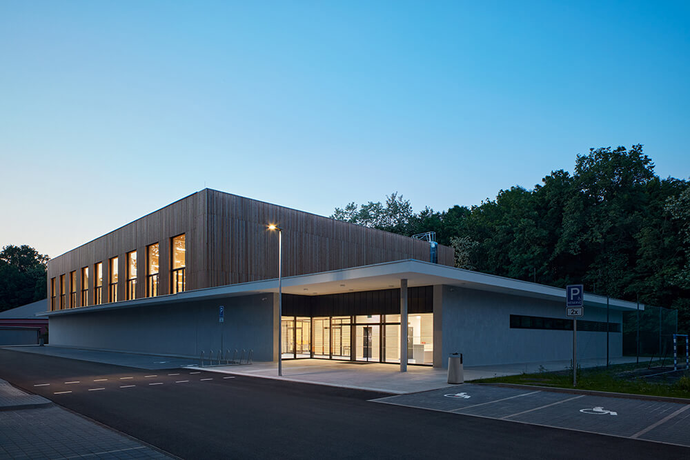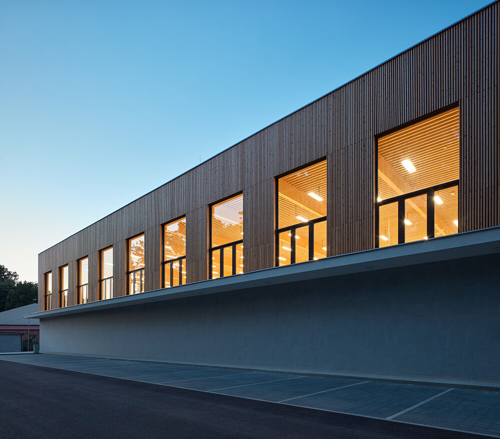 The building structure is founded on a monolithic reinforced concrete slab and the vertical support structure is made of precast reinforced concrete columns. The roof trusses are glued laminated timber with a 32m spans. The wall structure infill between the columns is of precast concrete panels. The whole structure is thermal insulated with ETICS. In the interior, acoustic sealing and cladding is introduced.