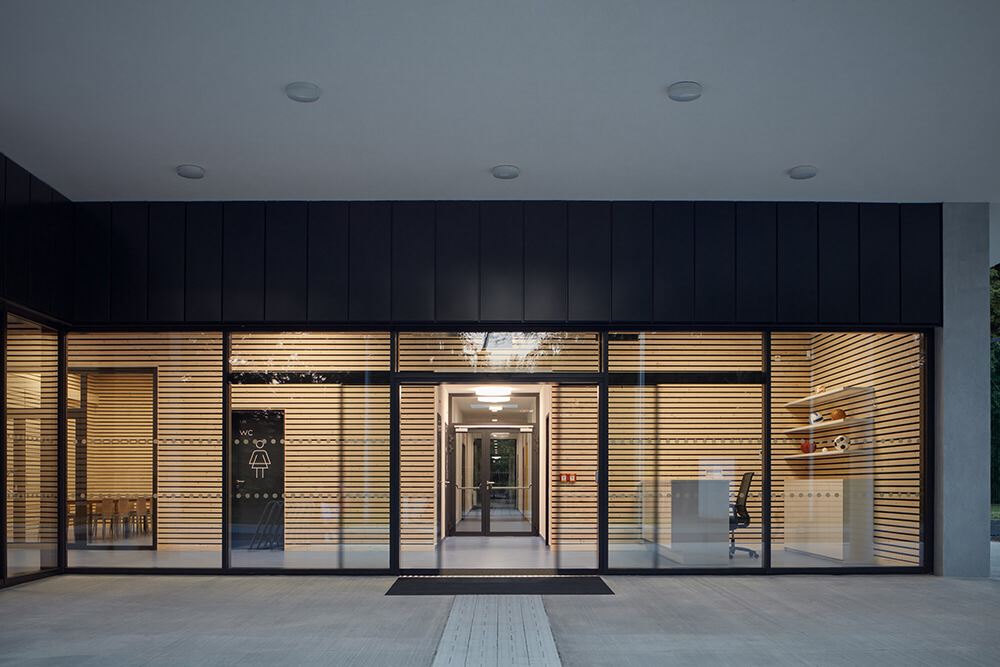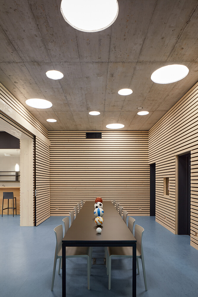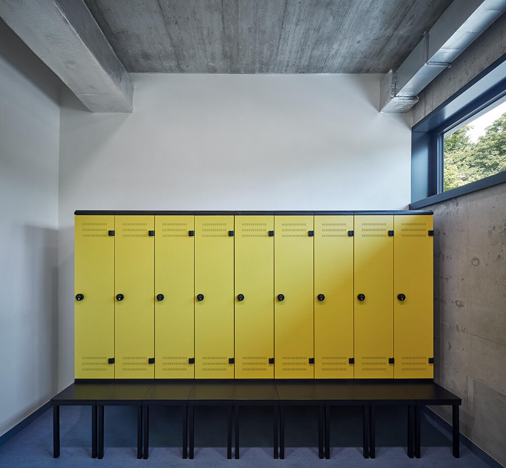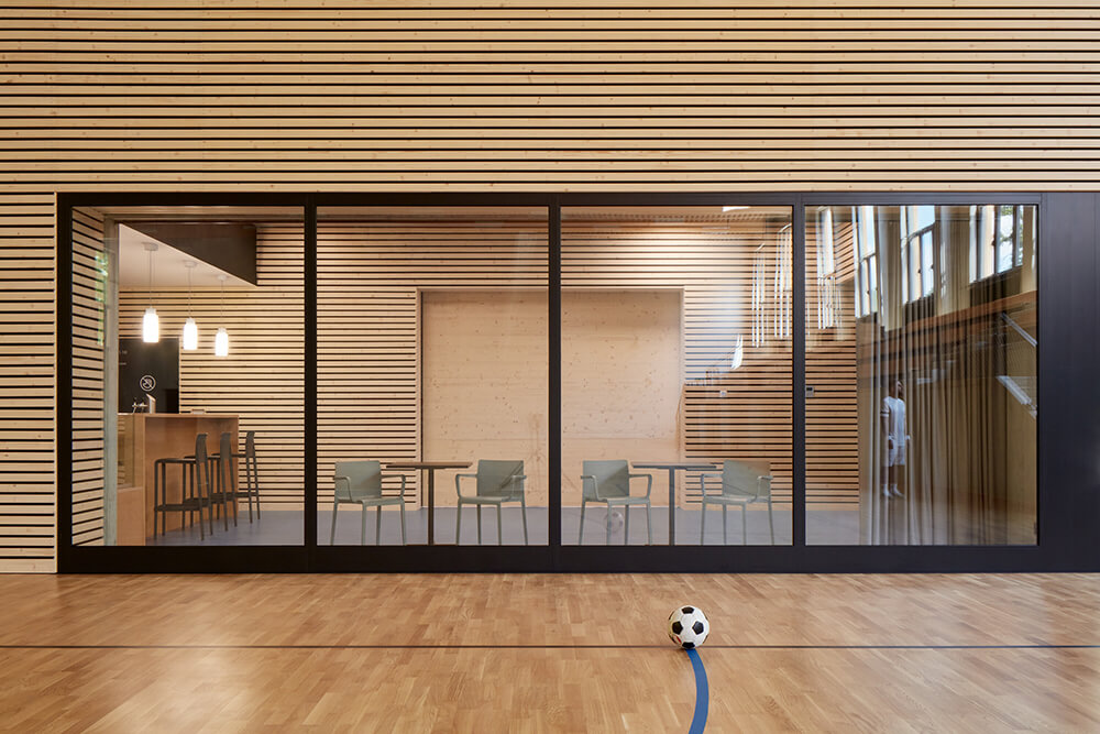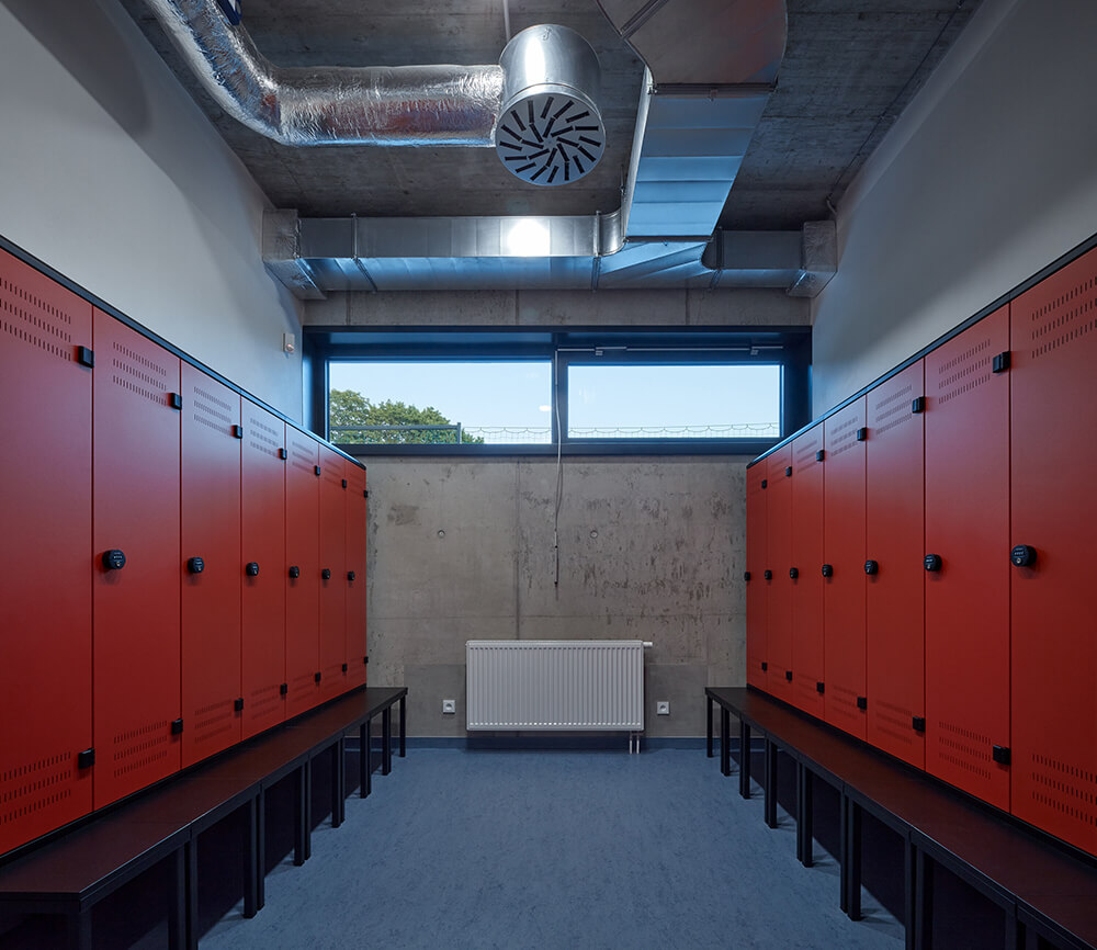 The entrance hall flows into a buffet. It’s possible to connect or divide the two spaces if necessary. Dressing rooms, toilets and technical rooms follows in this lower part of the building. Entrances to the playing field are separated for visitors and players.
