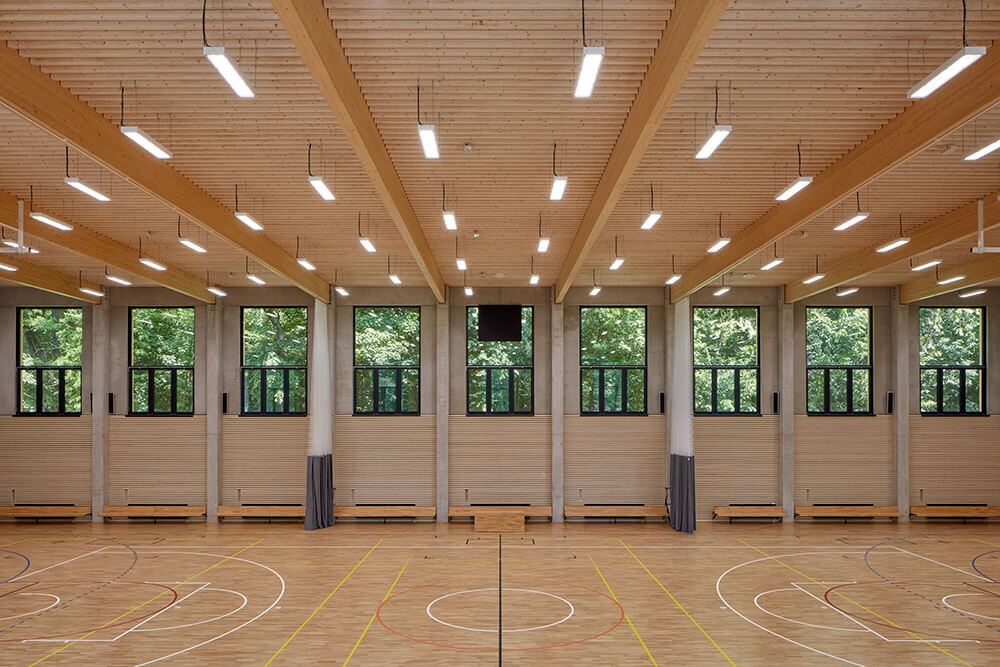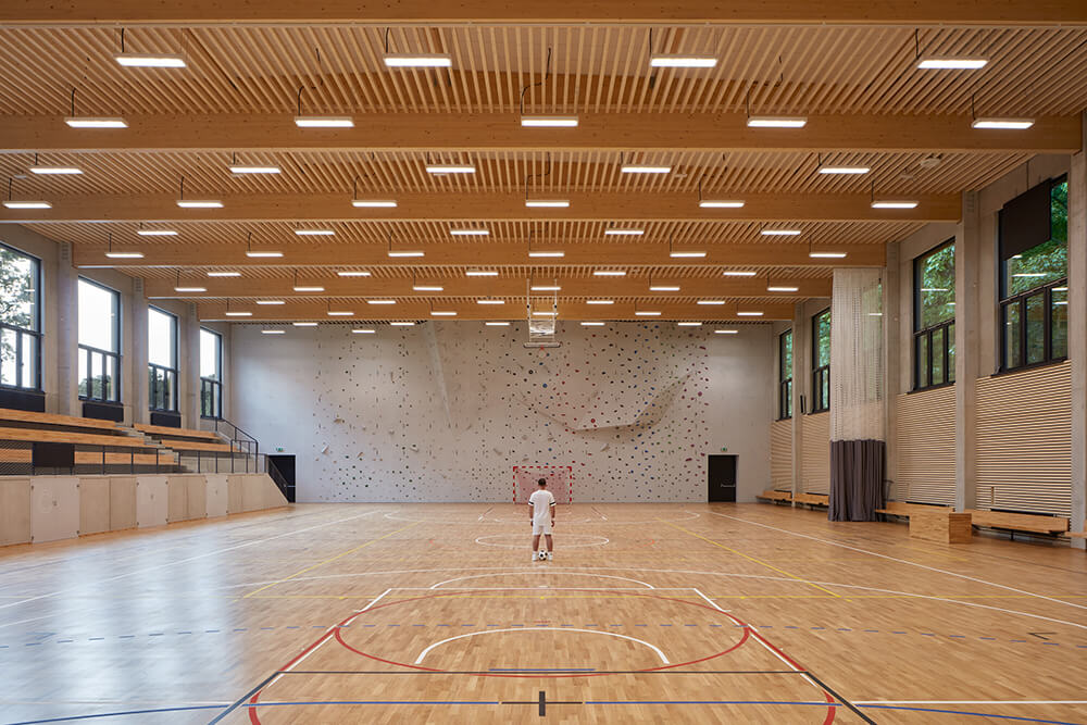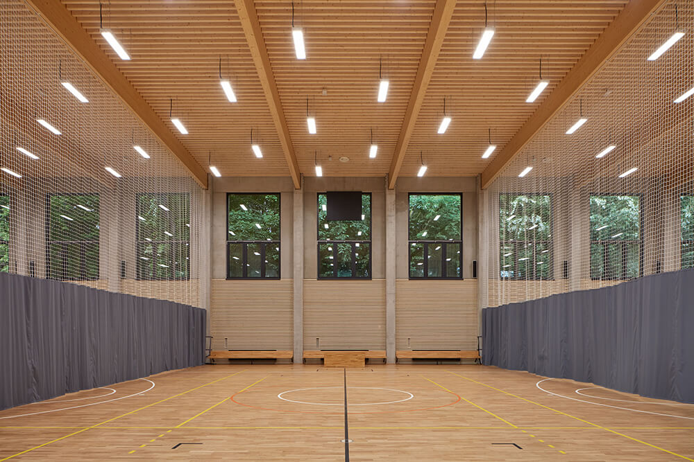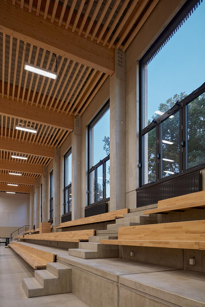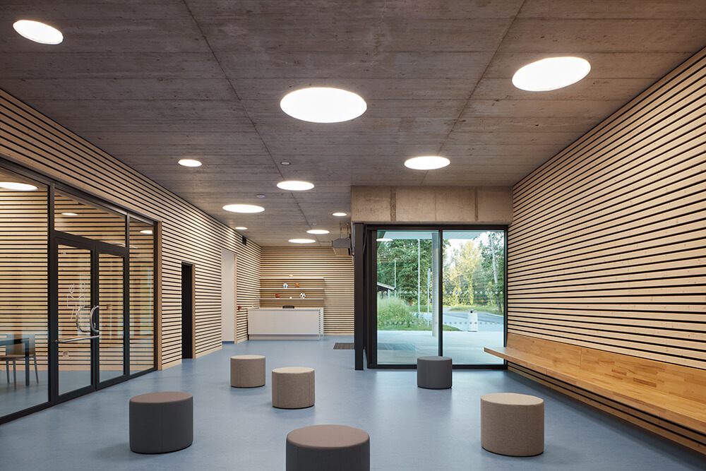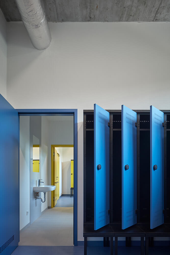The entrance hall flows into a buffet. It’s possible to connect or divide the two spaces if necessary. Dressing rooms, toilets and technical rooms follows in this lower part of the building. Entrances to the playing field are separated for visitors and players.