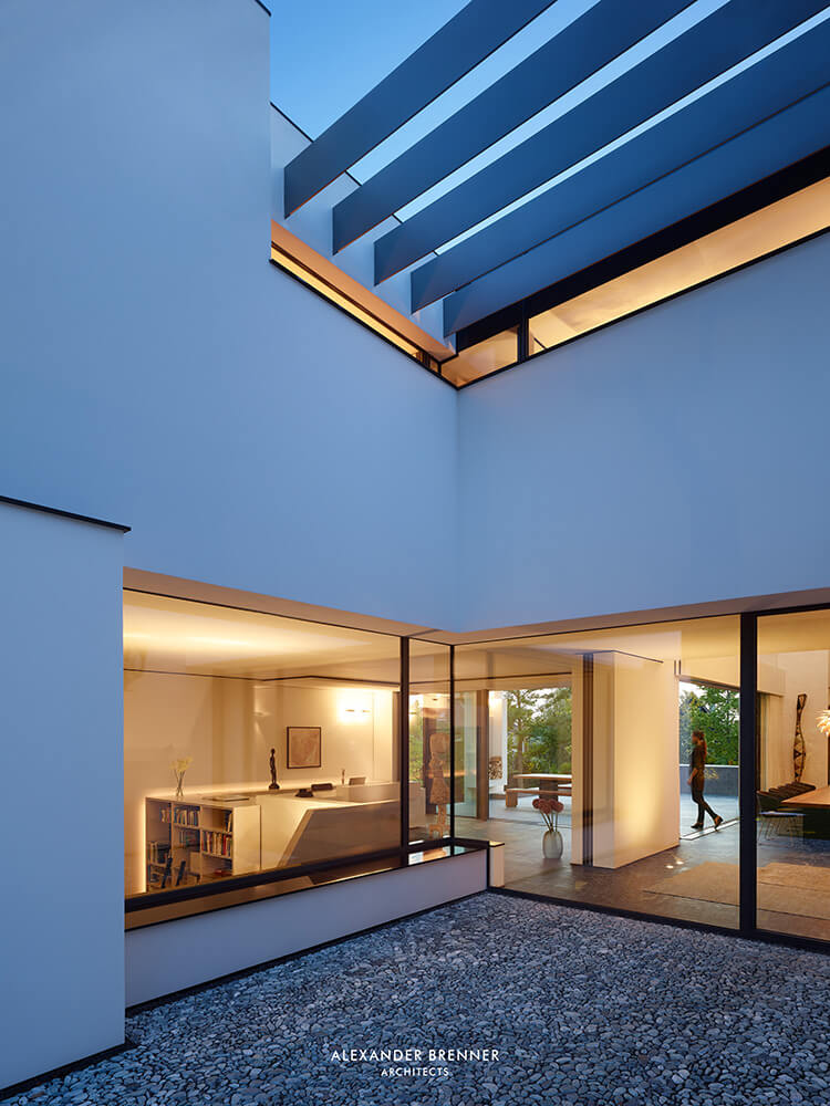 From the piazza at the entrance to the site a silvery garage structure leads past the upper garden with the lake and the “morning patio” with its pebble stone flooring to the entrance on the north side.