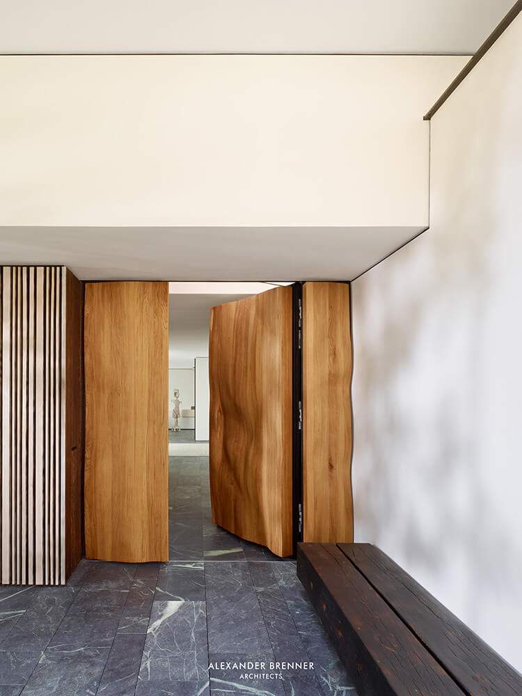 From the southern office – and workspace a narrow sculptural staircase leads down to the studio. This two-storey high, almost sacral area serves to present works of art – a passion of the client. Right next to the studio a storeroom for artwork is attached. The majority of the garden level consists of the pool and spa area.
