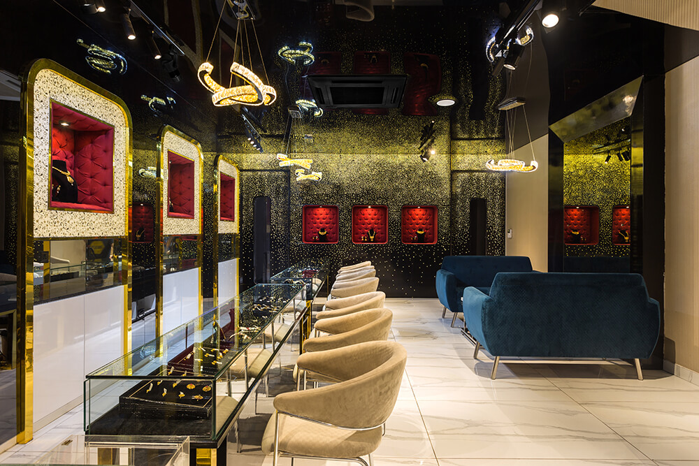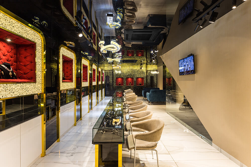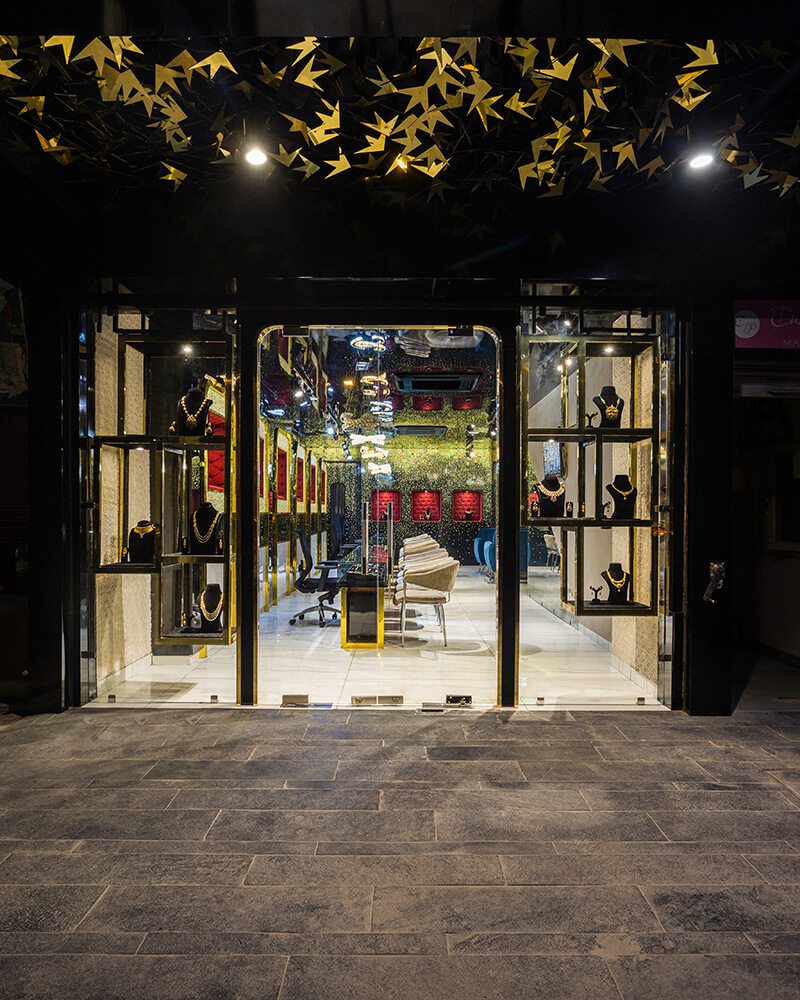 The creation of a pronounced space for a retail venue highlighting a varied collection of jewelry and accessories was the idea. The entrance is riddled with a cluster of stars that represent the whole aura of the store in order to emphasize the idea of “Swarn”. There are differently oriented peculiarities, suited to their own taste. The imitation of the intricacies and the significance that the ornamentation holds in the culture were achieved with the linearity of the space. The individualism is magnified from the black and gold tones that elaborate a royal aesthetic. On the ground floor, this culture was interpreted with different design elements. The walls were provided with niches which were finished with quilting for singular designer pieces, promoting a higher albeit a kingly standard of inheritance. Enclosed in a gold frame, the displays attract an attention to the details. Black vinyl sheet with punctures ranging from 2-4mm with backlit acrylic sheet surround the display in the background. An alluring scenario of a rain of gold which becomes a sight to behold and endear is created by the gradually fading punctures. The verticality of the store is prolonged by a reflective stretch ceiling.