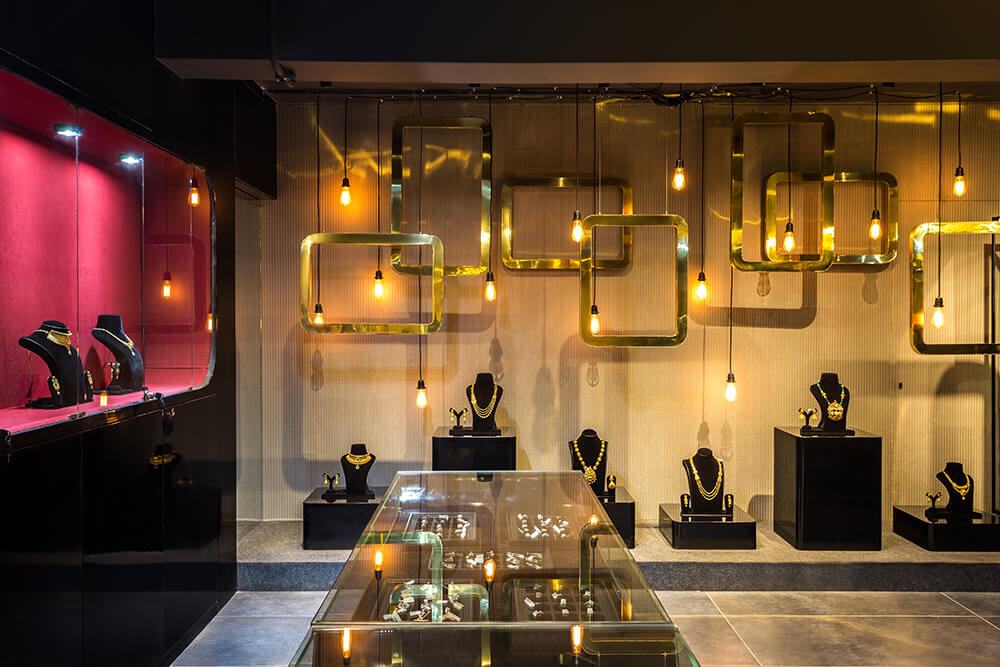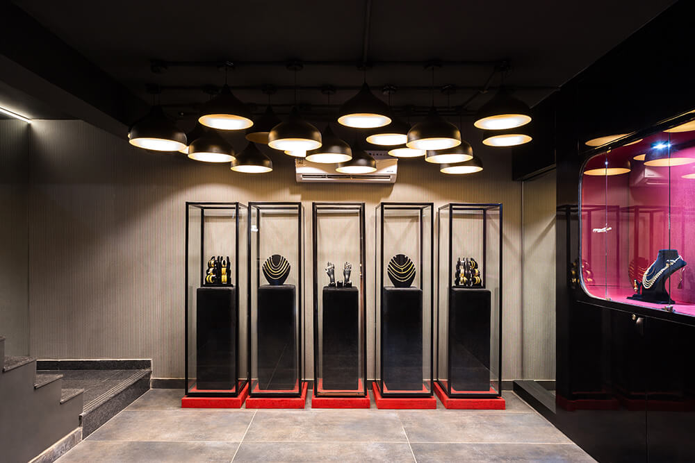 The basement has a similar aesthetic in a more intricate form. The compositions of the gold frames become complimentary to the environment. Here, the jewelry pieces are put up on pedestals and encased in glass frames which create a sense of elite. Again, the linearity of the space is complimented by the verticality of the design language. Rows of frames and free standing displays put forward the magnificent details of the collection. At the back a series of golden metallic frames suspended from the ceiling form a rhythmic composition which brings attention to the exquisite jewelry. The dark shades of the ceiling and black reflective mirrors become a subliminal presence which accentuates the importance of the gold. In essence, Swarn shares the individuality of each person, unique and royal unto themselves. Each piece, display crafted to some peculiar taste, the design becomes a cultivation of a personalized notion of being.