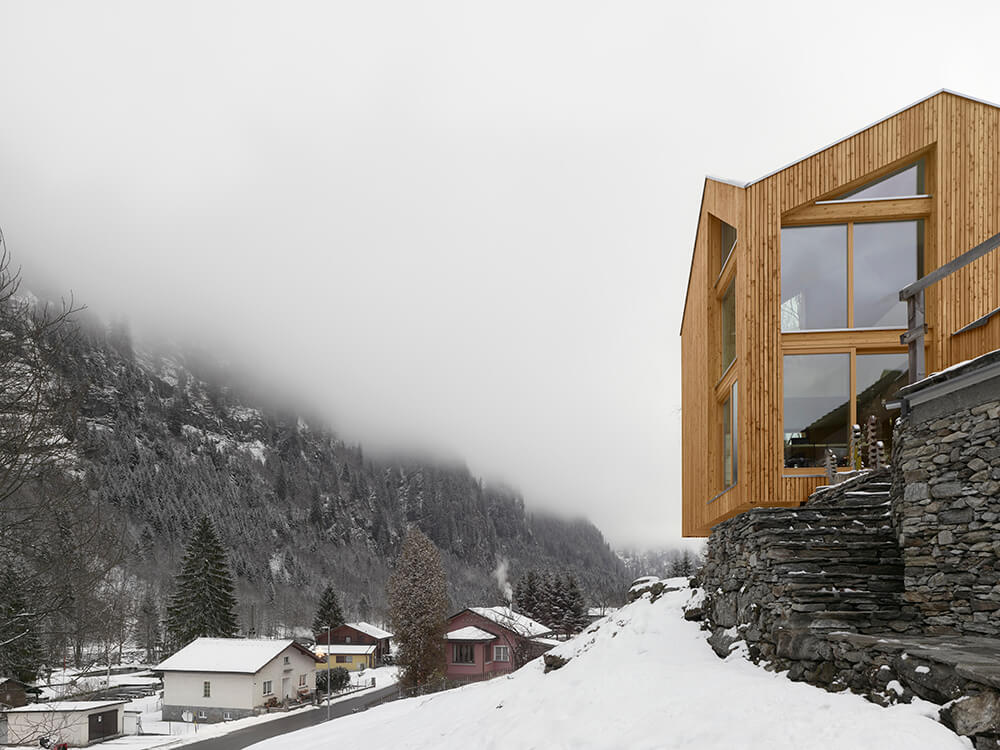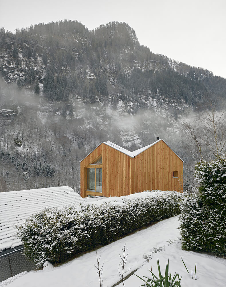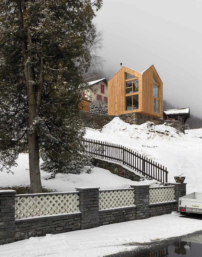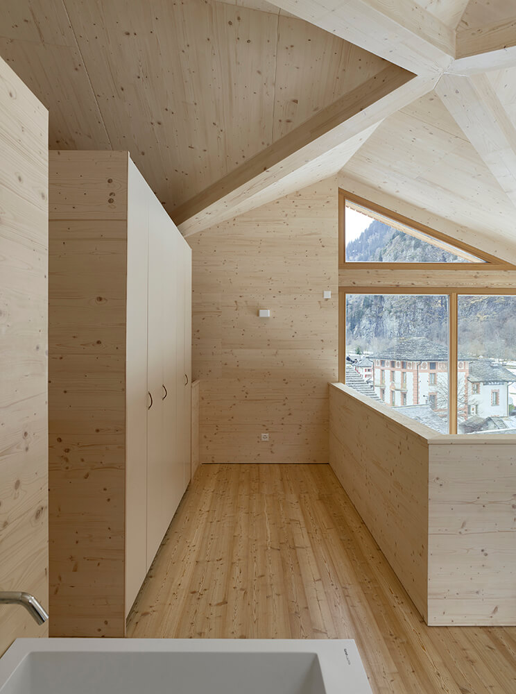 The roof has a complex design at first sight, it is the result of an analysis of the surrounding context, of the different types of roofs and slopes present in the village of Rossa. The inclined surfaces suddenly disappear from view and you do not have a clear understanding until you enter the building and then, thanks to the double height you can grasp the spatiality of this small body as a whole. This is not meant as a game in virtuosity but to emphasise the importance and meaning of the roof through the simple pleasure of the unexpected space.