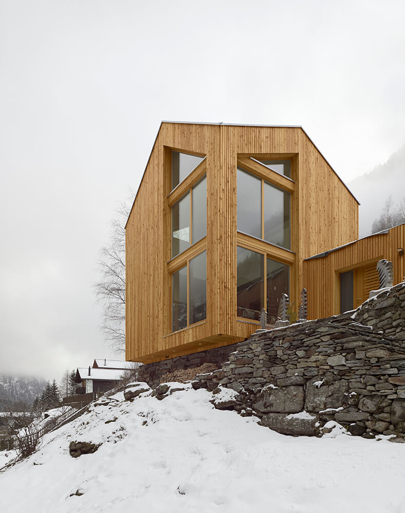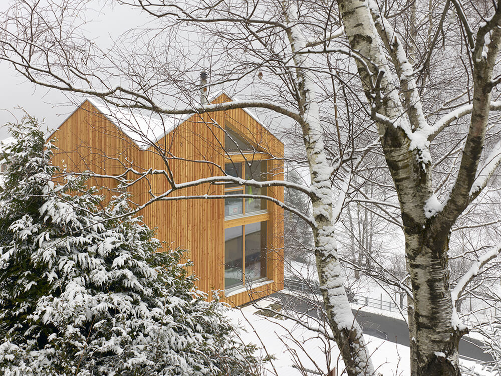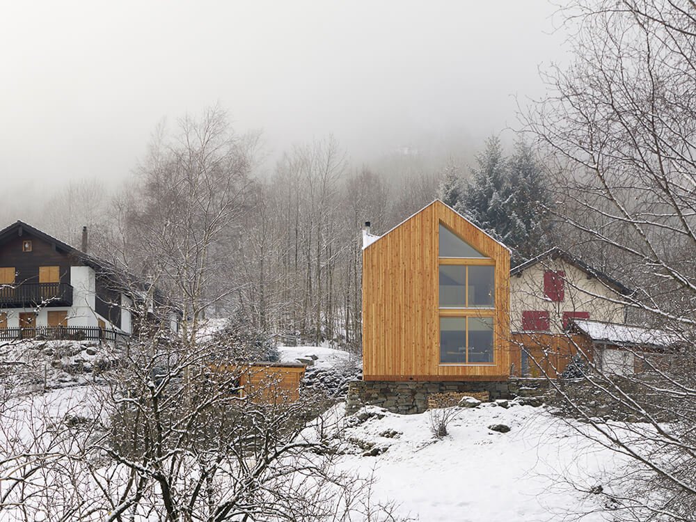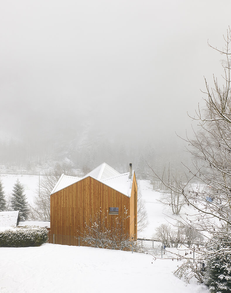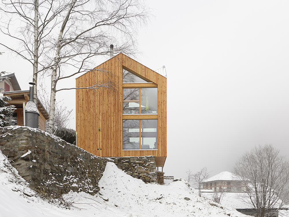 The roof has a complex design at first sight, it is the result of an analysis of the surrounding context, of the different types of roofs and slopes present in the village of Rossa. The inclined surfaces suddenly disappear from view and you do not have a clear understanding until you enter the building and then, thanks to the double height you can grasp the spatiality of this small body as a whole. This is not meant as a game in virtuosity but to emphasise the importance and meaning of the roof through the simple pleasure of the unexpected space.