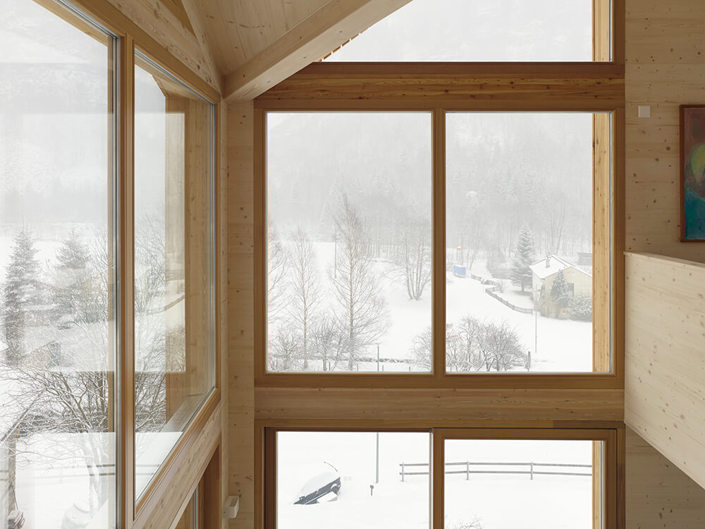The interior walls are clad with 3-layer panels in exposed fir, naturally treated, while the mezzanine floor and the roof are constructed with multilayer XLam fir elements in fir.