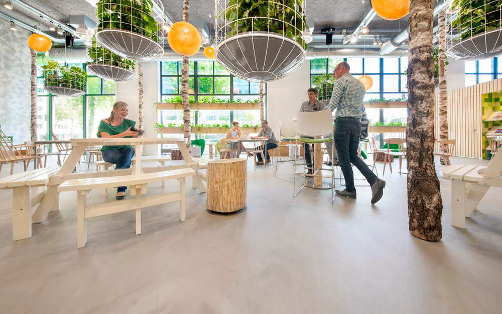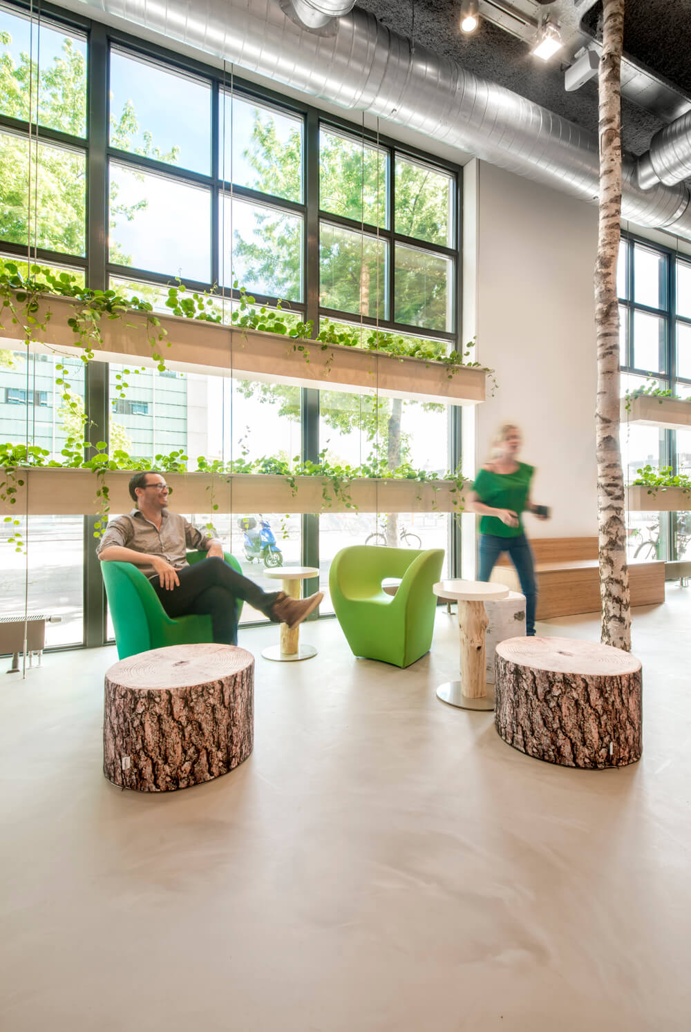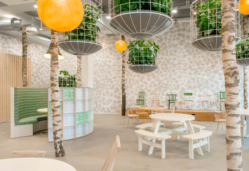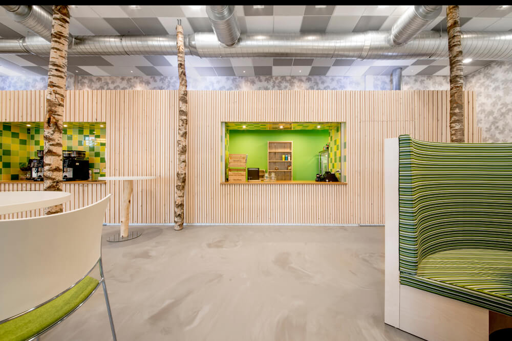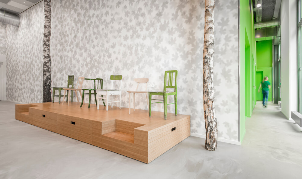 By this we have added a space to the building with the peace and playfulness of a green park. Large different plant cages hang like a canopy between the real birch trunks. Along the large glass doors planters are hung that form a natural filter. On the walls a print of the shadows of the leaves was used, and the floor has a natural “outside look: with its gray/brown tones. The consistent use of the colors white, brown and green brings a certain calmness between the otherwise fairly random placed elements. This seemingly random placement of trees, plant cages and furniture is in reality a precise positioning relative to the projector and the walking paths.