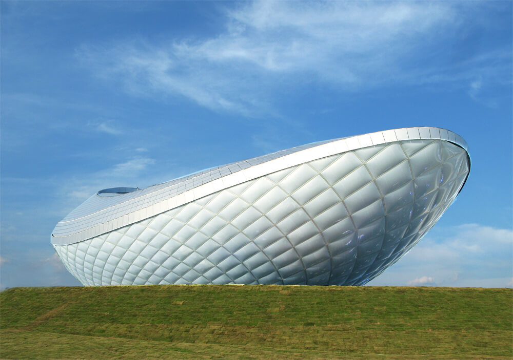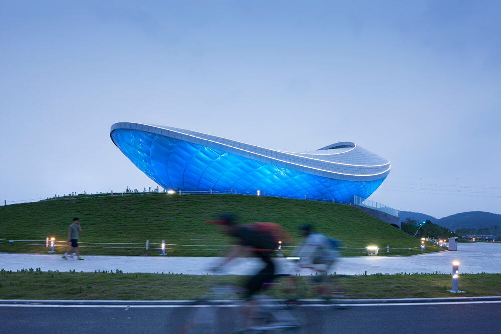 The architecture of the River Culture Pavilion ( ARC ) is a powerful formal statement that combines nature, technology and space. The bold curved form of the ARC is perched on a peninsula that juts into the river and surrounded by an awe inspiring natural environment. The building is a strong focal point set against a stunning panoramic landscape. The architecture is comprised of a vessel shaped form that is clad in silver fritted ETFE pillows that through a play of transparency and geometry creates an ephemeral effect in close proximity.