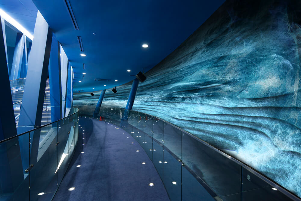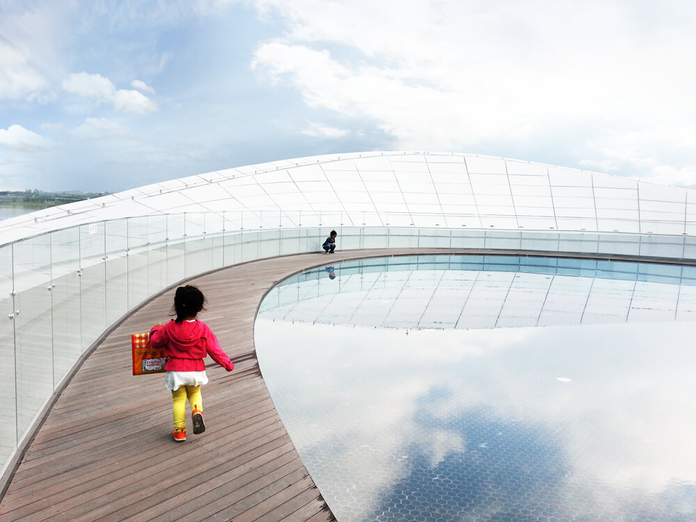 This atmospheric quality of the building enclosure is heightened by light reflections from shallow pool of water that surrounds the base. While the visible portion of the building sits atop an artificially formed landscape, the exhibition gallery concealed below is the space through which the visitors enter. While the exterior of the ETFE clad structure captures the quality of the changing light with the open sky and river landscape as backdrop, the darkened and hermetic interior of the main structure houses an immersive multimedia environment illuminated only by projections of the abstracted and re-conceptualized site. The experience of the visitor that is enabled by the architecture is therefore an alternating play between a ‘real’ experience of the water, sky and landscape that comprise the site, and a virtual experience as presented through multimedia. This experience culminates on the roof where a large reflecting pond reflects the sky and an observation terrace enables the visitor to overlook the site and its natural surroundings from yet another perspective.