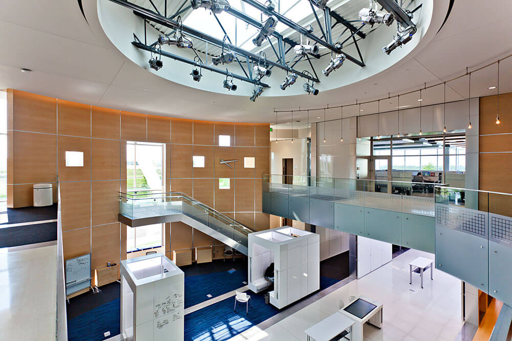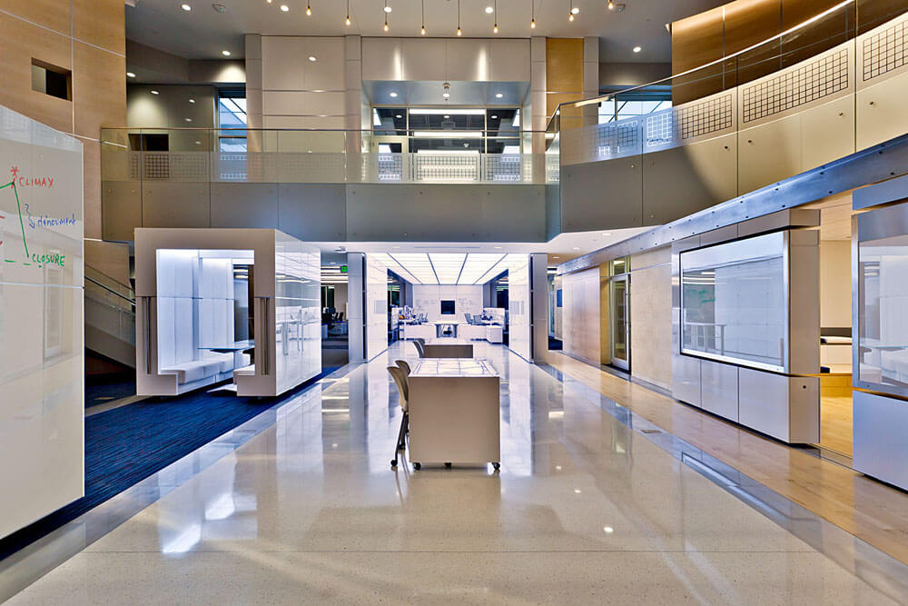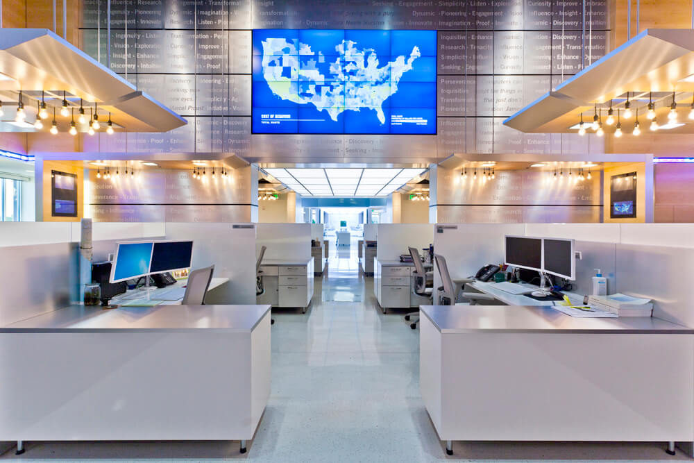 The Solutions Gallery forms the heart of the collaboration space. It is equipped with a selection of elements allowing for maximum flexibility and spontaneity, including the accommodation of large formal gatherings. Mobile office spaces on tracks can create variable-sized meeting space offering privacy for sharing proprietary information. There are tracking interactive monitor array walls, mobile interactive tables, and mobile desks and workstations. Live feeds from dozens of sources provide a steady stream of data and information across monitors located throughout the space, underscoring the strategic innovation that is a constant at Express Scripts.