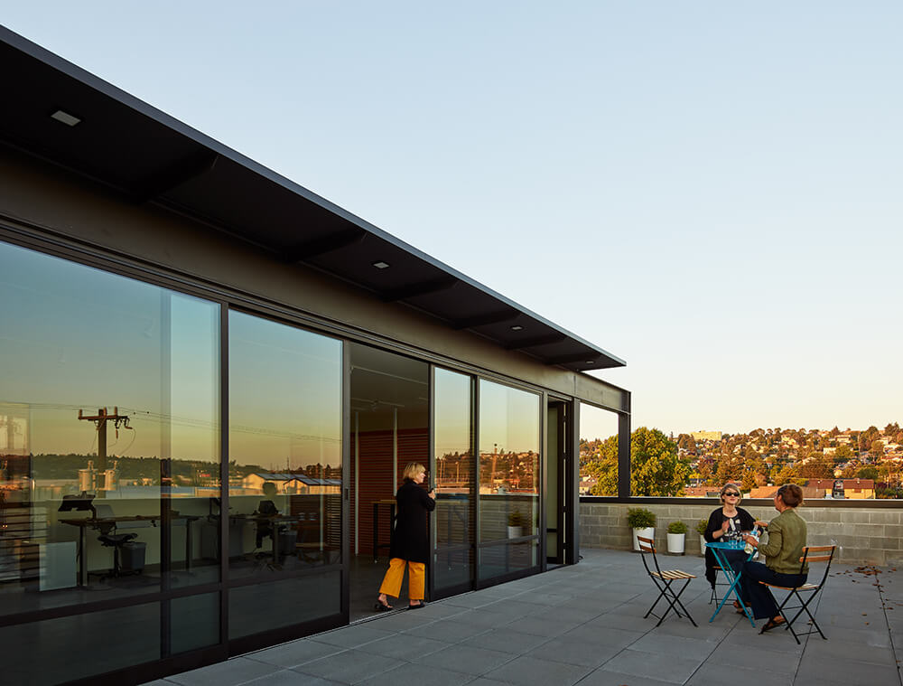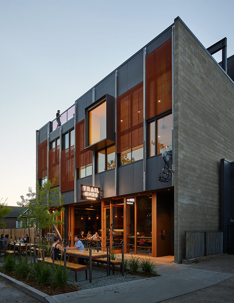 The Klotski is a three-story, mixed-use infill building situated in the Ballard neighborhood of Seattle. Close to downtown, the area is noted for its dynamic mix of commercial, manufacturing, and residential uses. Reflecting the eclectic vibrancy and gritty nature of the neighborhood, the 10,041-square-foot CMU and steel-framed building houses a beer hall, an office, a maker space, a studio, and a small caretaker’s apartment.