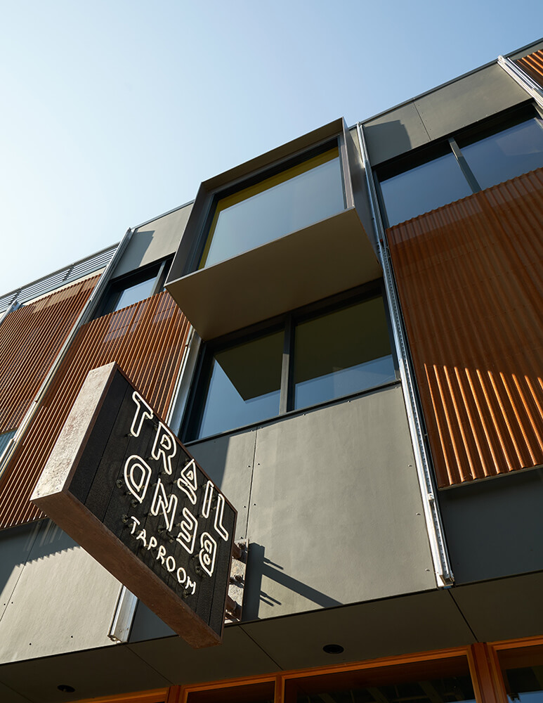 At street level, the building is set back from the property line by several feet to provide space for exterior dining; expansive glazing composed of wood/glass sliders and fixed units reveal the activity inside to the street. The building’s massing steps back at the top floor to create an outdoor deck for the studio and apartment. The glazed, second-story wall of windows features a steel-wrapped bay window that extends out over the sidewalk. Inside, the clear-spanning steel structure and brace frames are exposed, complementing concrete floors and wood decking. An open floor plan and seventeen-foot-high ceilings create a loft-like industrial aesthetic for the office housed within. Conceived as a maker space studio, a self-contained mezzanine accessed via stairwells and elevator floats within the second floor volume. A studio and caretaker’s unit occupy the top level. Generous roof decks and an interior courtyard round out the spaces, ensuring ample indoor-outdoor opportunities. On-site covered parking is accessed off the alley for retail customers and residents.