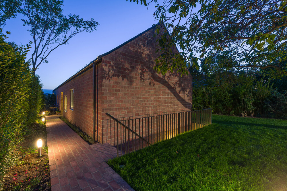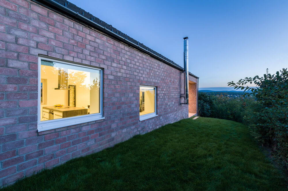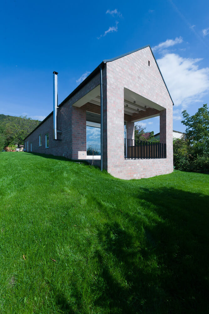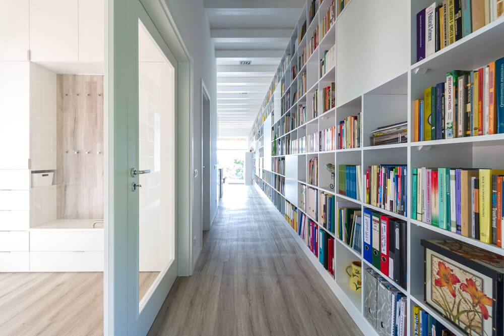 “Taking into consideration the narrow and long shape of the building site, the way of the sun and the low budget programme, also the age of the couple who are to be retired soon, we advised them to realize a straightforward base plan, where the spaces are linked with a long corridor and public spaces face the panoramic view of the valley. At the same time, to avoid creating under-utilized space we discovered the great potential of the corridor concept. We turned this horizontal axis into a highly beneficial and unique element of the house, a 17meter long wall of library.” – remarked the architects, Laszlo Foldes and Peter Sonicz concerning the design concept.