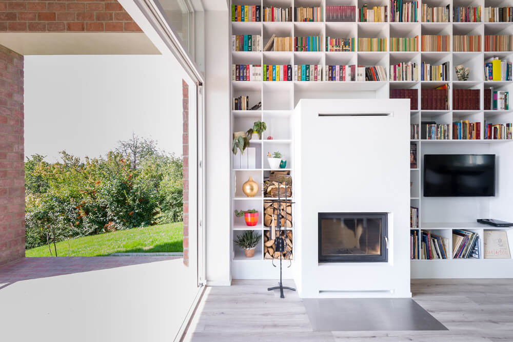 The giant bookshelf fulfils more functions than one might expect. Throughout its 17 meters the modular system architects designed opens up, enabling a window to perfectly fit in, and a window seat – thanks to the 50cm deep walls. In the living room the shelves are united with the fireplace.