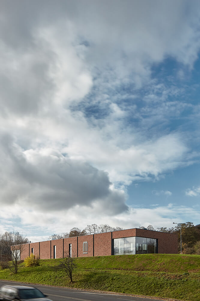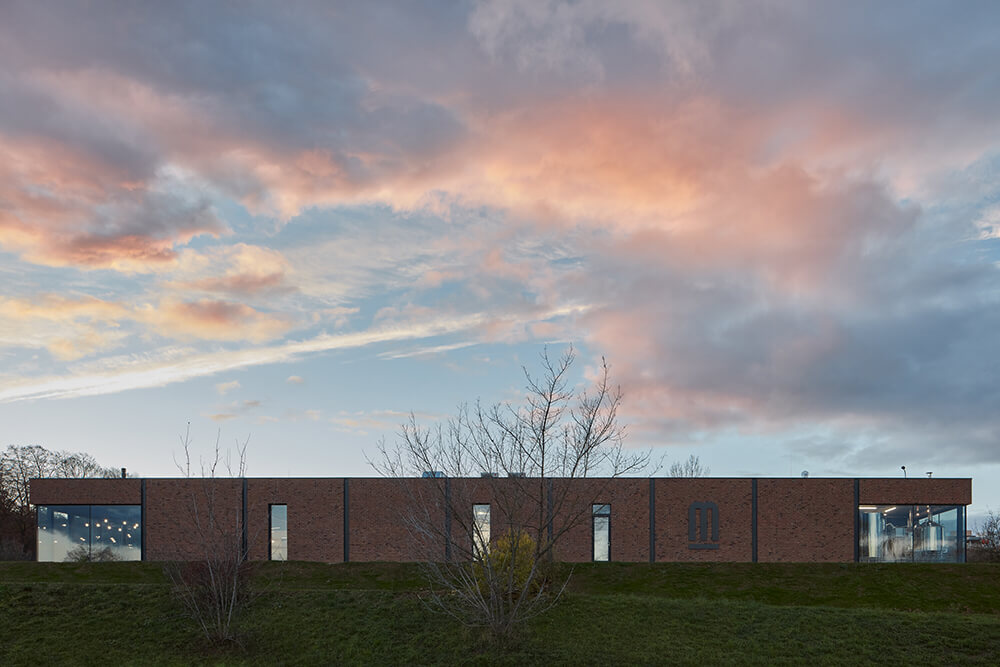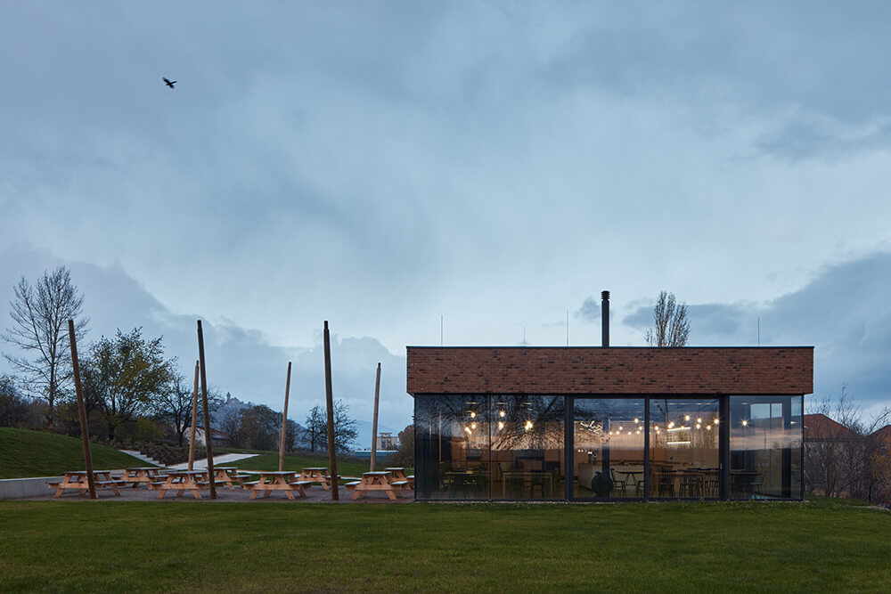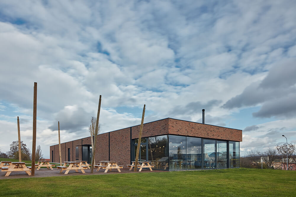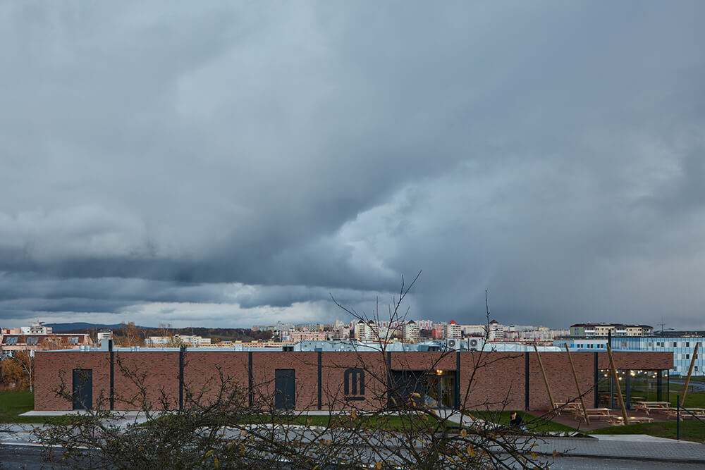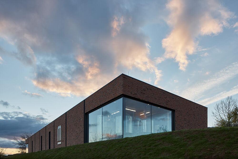 The building, utilising a minimalist design, is built on a rectangular ground plan on Pod Koňským vrchem Street. The town’s complexity and the relatively complicated plot has led us to a solution using a simple shape. The brick façade features two significant glass areas at both ends. One side offers an open view to the interior; the other side allows a view of the brewery. Between these large windows, the façade consists of pale brickwork.
