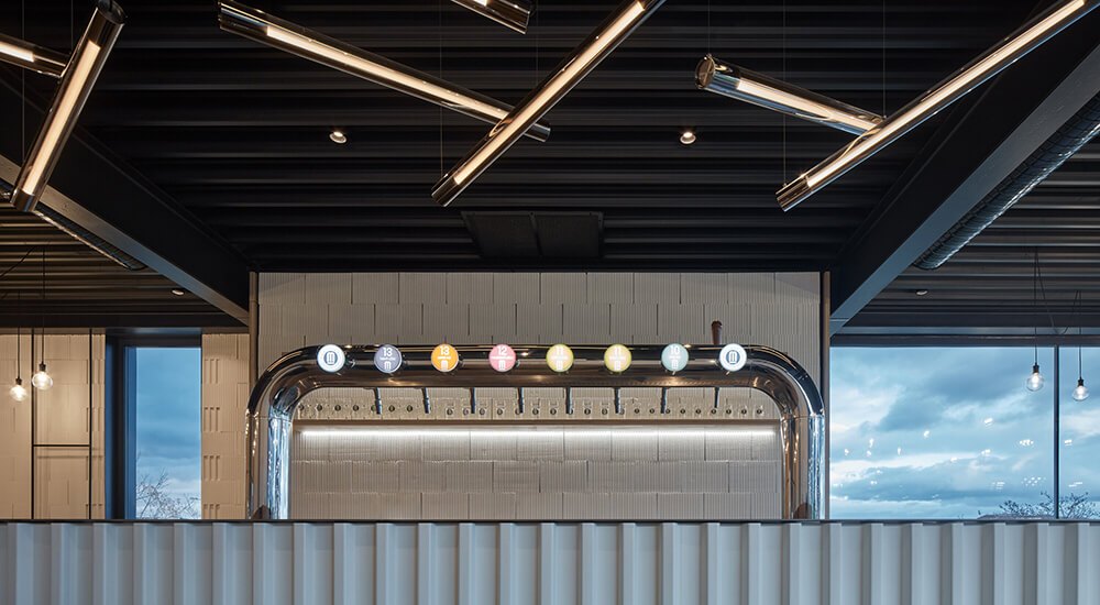 Dominating the façade is the graphic, black steel plate logo featuring the letter “M”. As the focal point of the façade, the logo articulates the overall straightforward image of the building and communicates with its surroundings. It also relates to the beer brewed inside. Adjacent to the restaurant is a terrace partly covered by a wired construction. In the summer months, the construction will have hops climbing up it, just like in the nearby hop gardens.