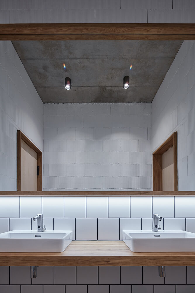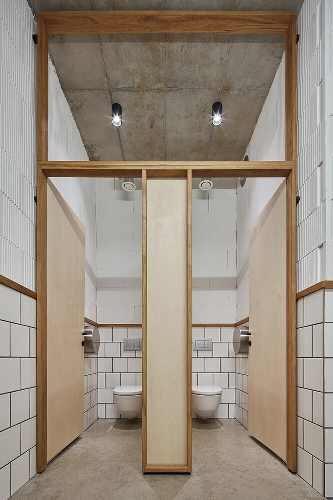 The interior’s design is also minimalistic. Most of the walls were finished with rough plaster and painted white. In various places, for example in the toilets and kitchen area, the brick walls are complemented with ceramic wall tiles. The main public space of the building – the restaurant – combines wooden furniture with metal details, steel construction components and brush finished concrete floors. At the centre of the restaurant are two main counters – a serving tap bar and a standing bar.
